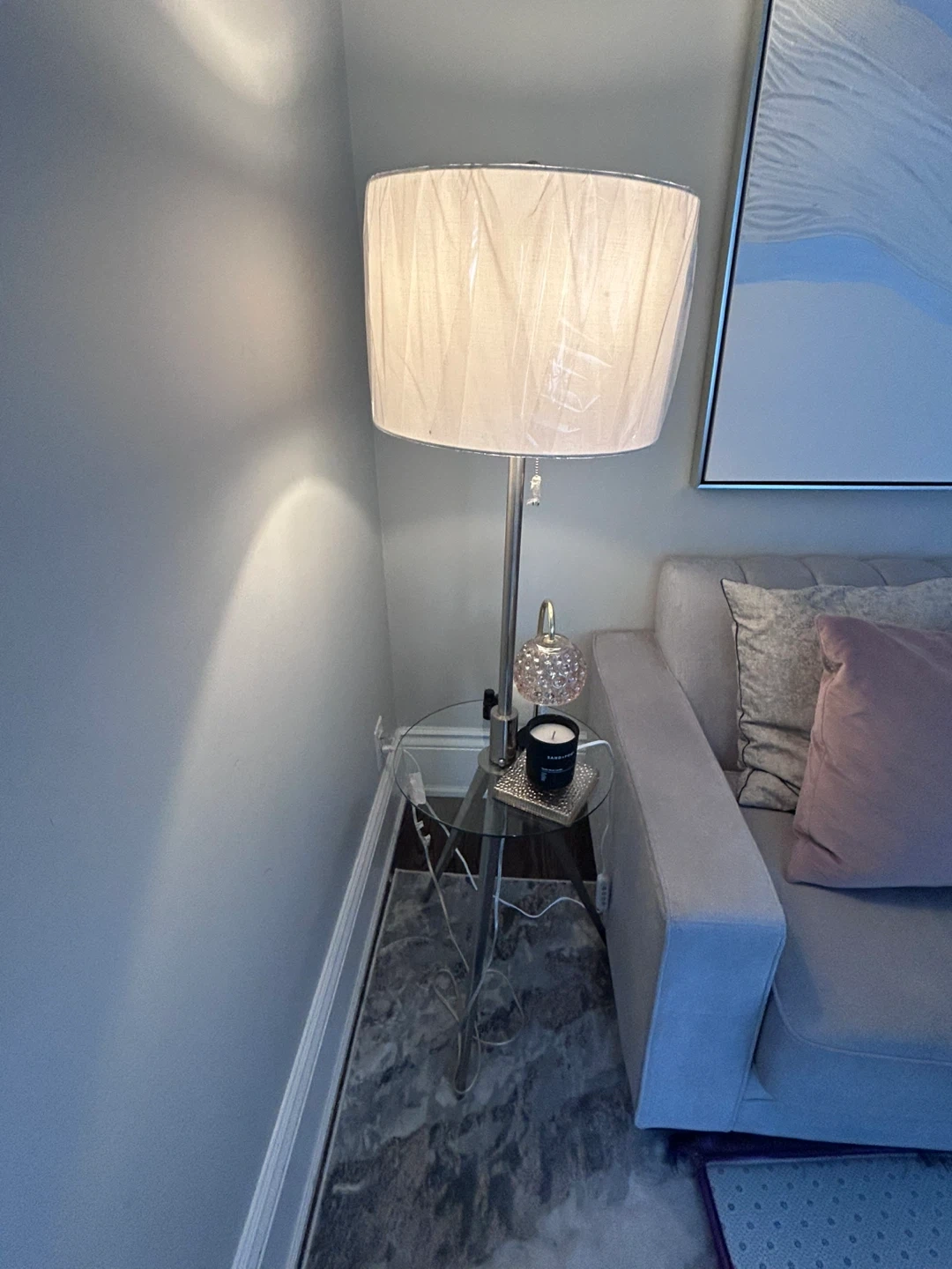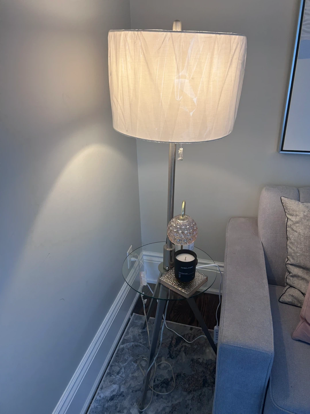 This is a floor lamp with a built-in side table. It's in good condition and would be a great addition to any living room or bedroom