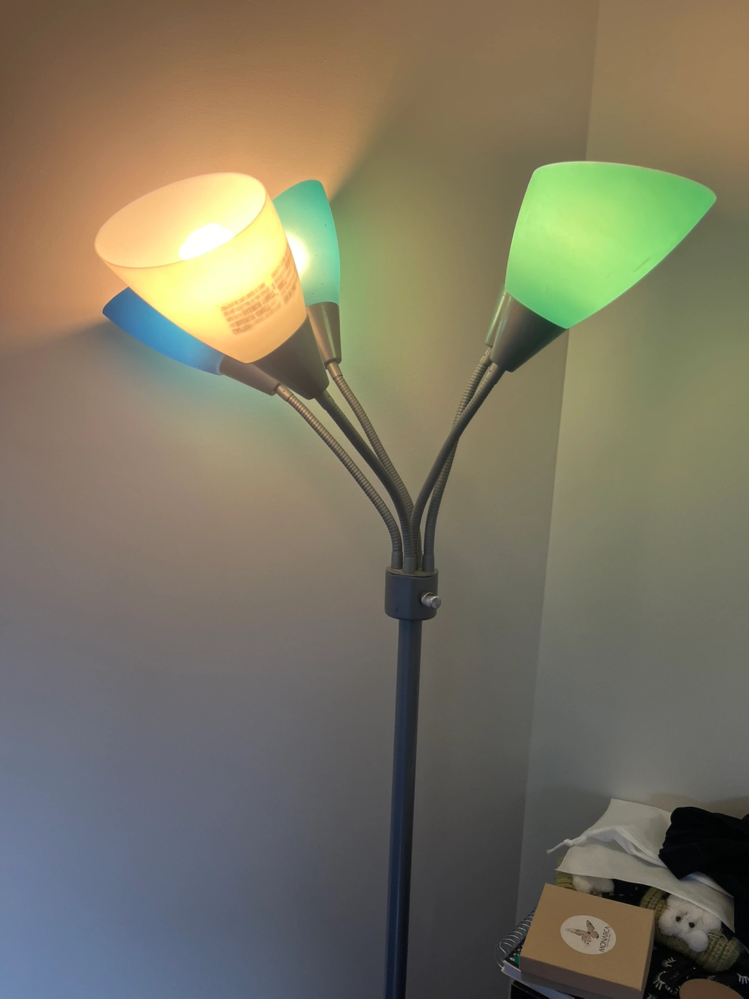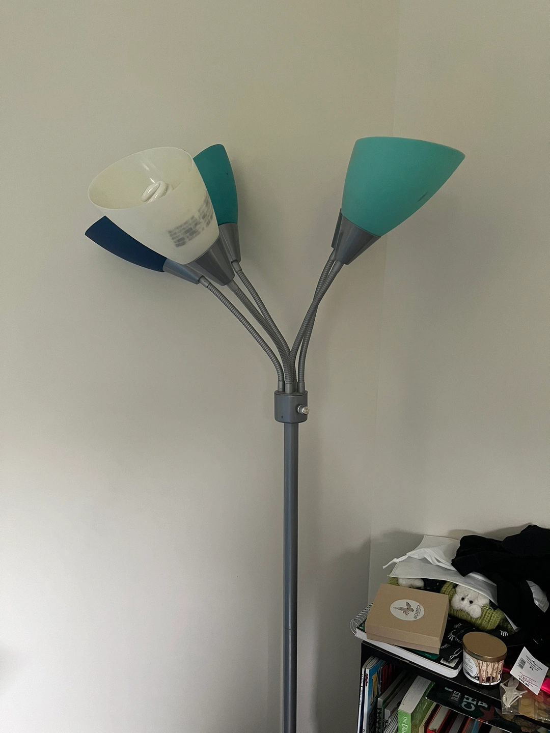 Floor lamp approx 5-5.5’ tall with five adjustable bulbs. Used but still lots of life in it so open to offers. Cute for a kids bedroom or a funky space but still pretty low profile so it doesn’t take up a ton of room.