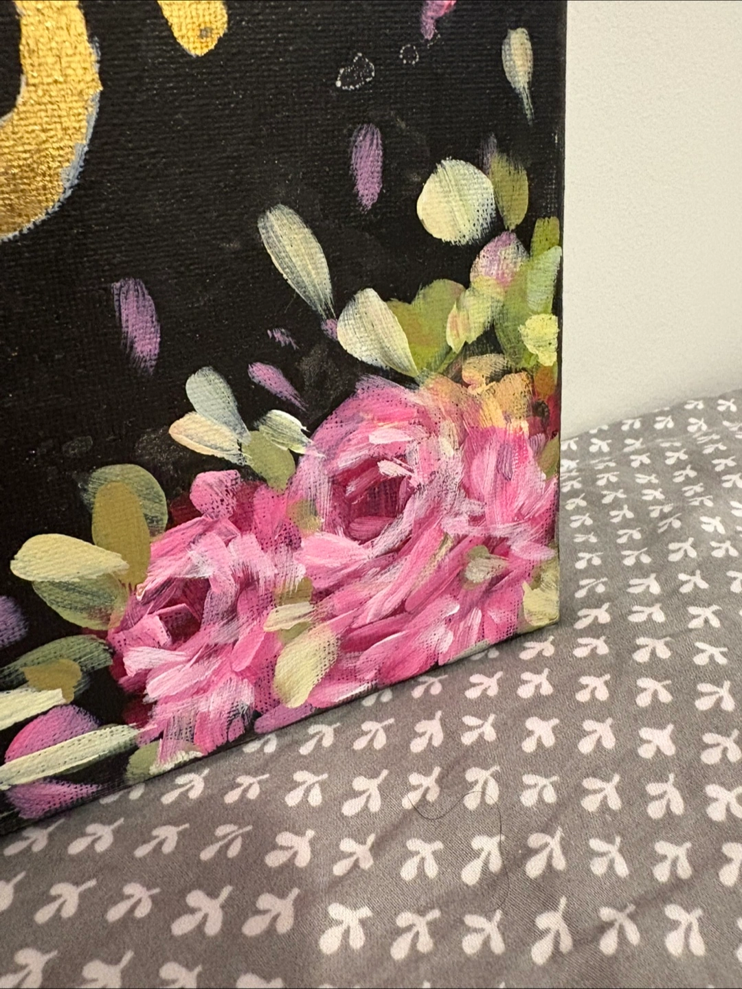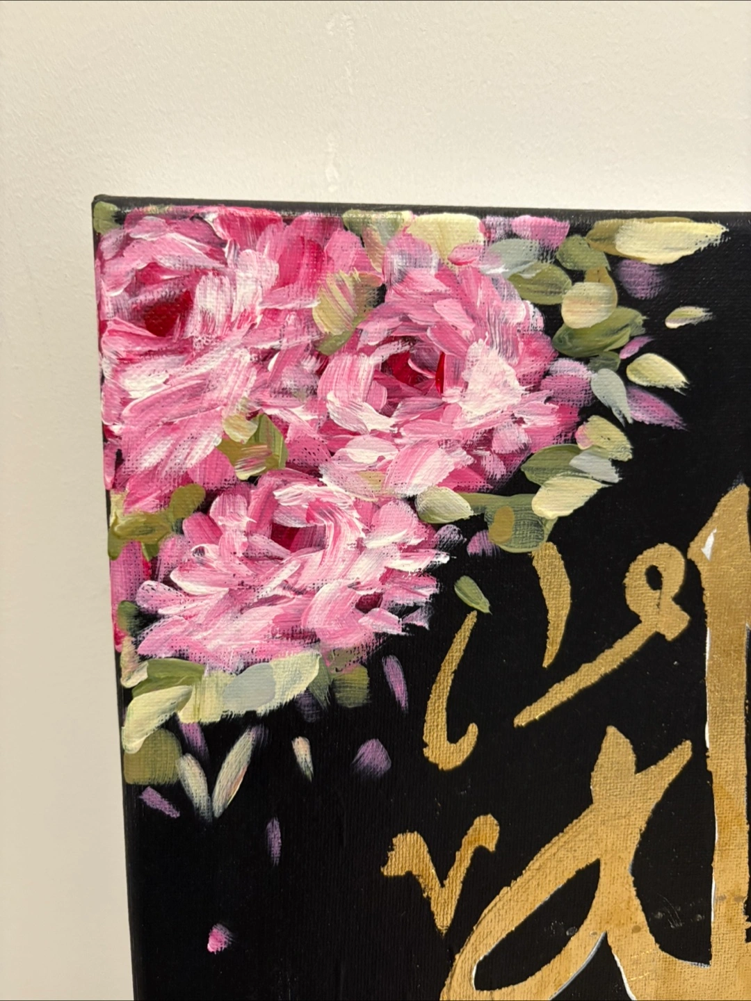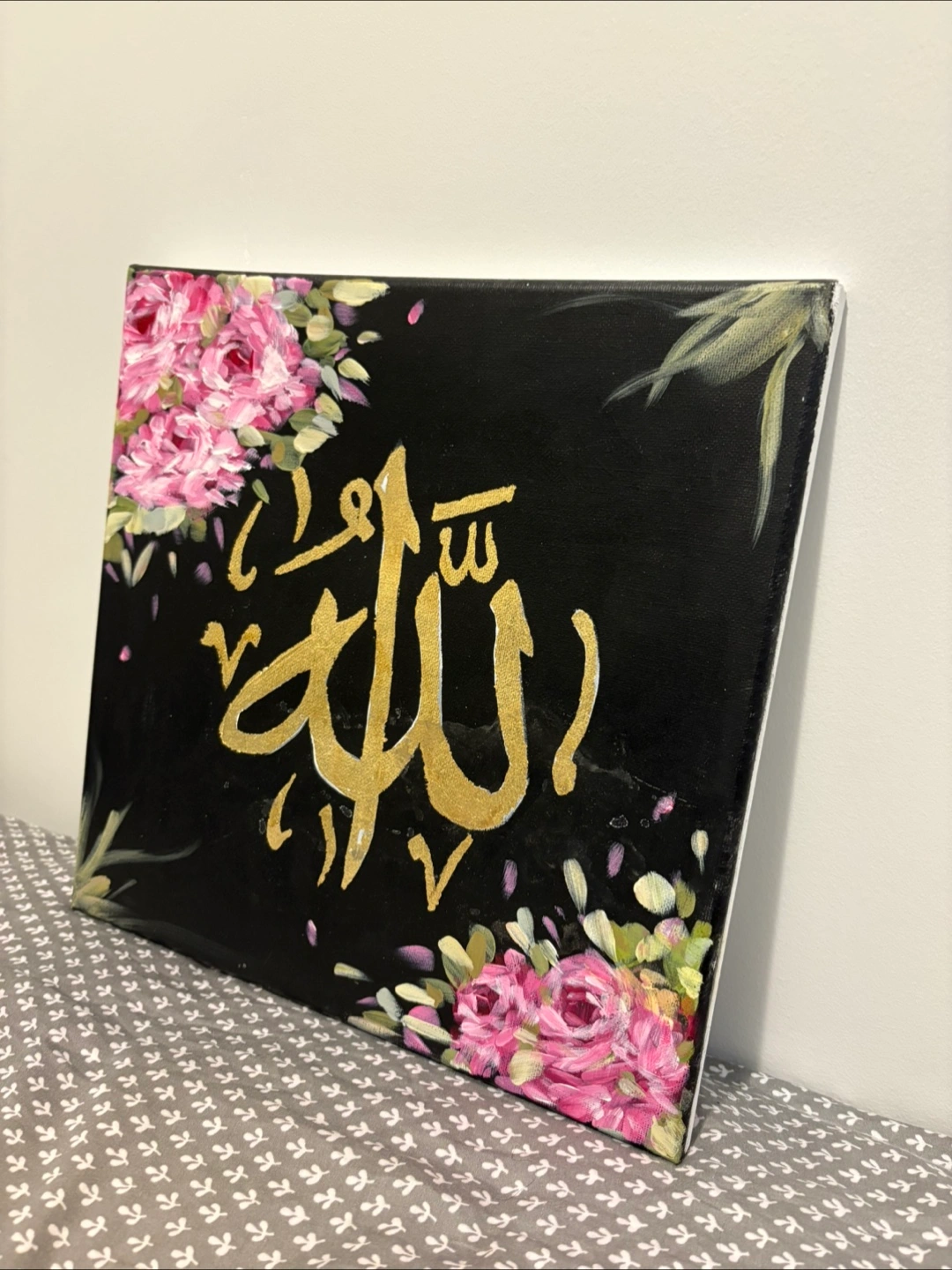 Square canvas painting featuring the word Allah in gold lettering, surrounded by lovely pink flowers on a black background. Hand painted!