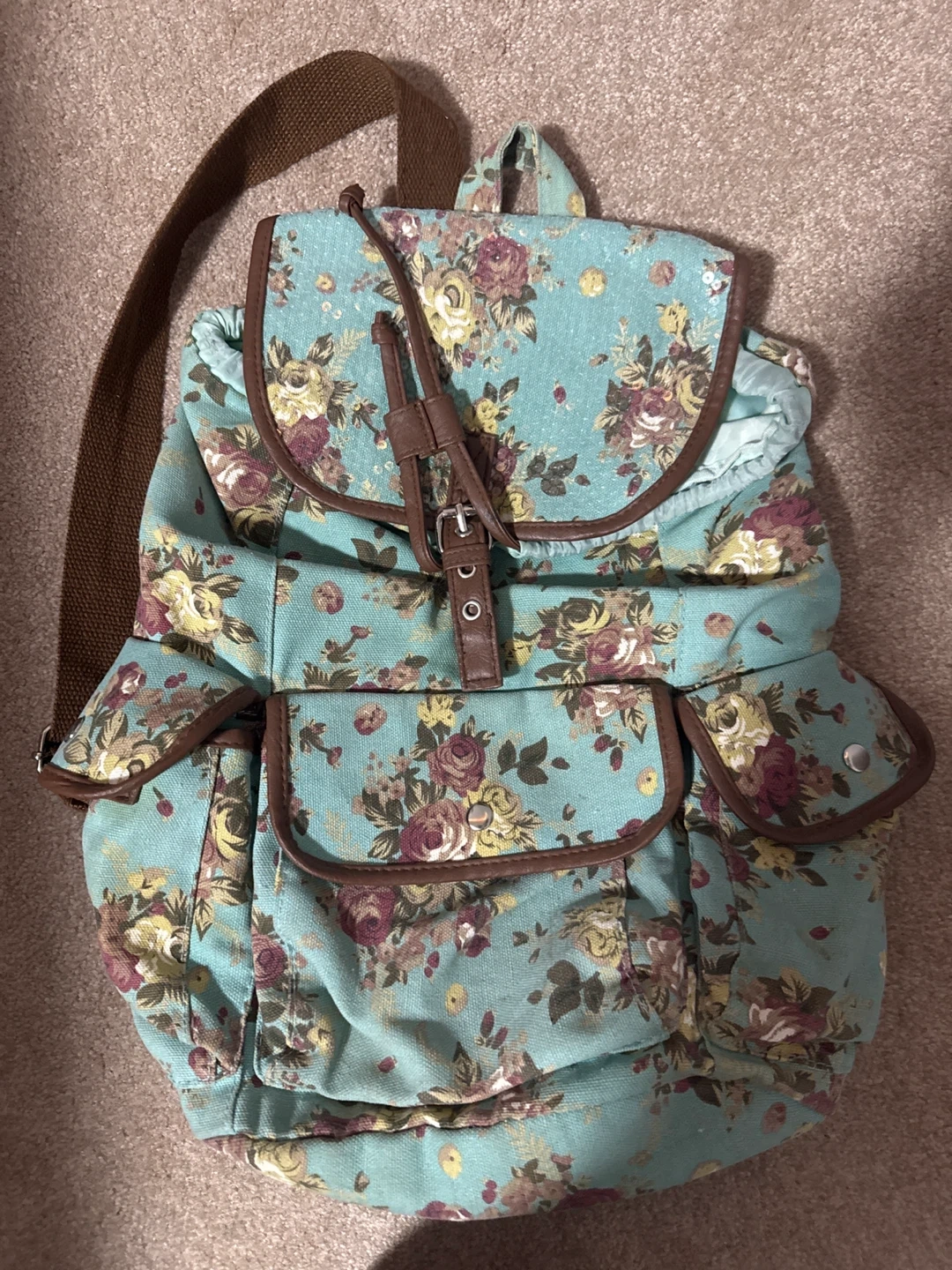 Cute floral backpack with brown accents! It features a flap closure with a buckle detail, a drawstring closure, and two front pockets. The straps are adjustable, making it comfortable to carry around. Perfect for everyday use!