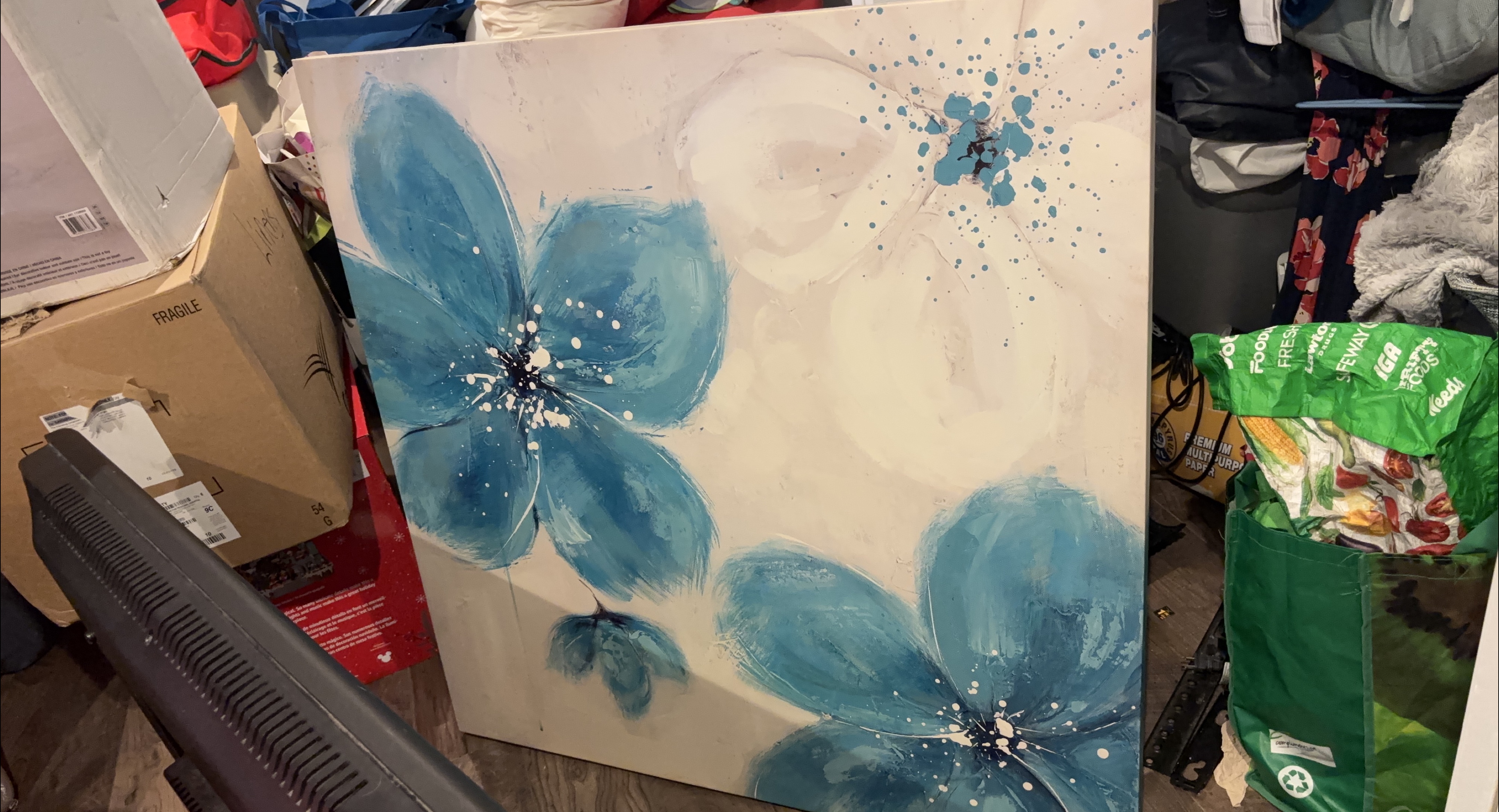 Add a touch of spring to your home with this lovely canvas wall art! The painting features beautiful blue flowers on a neutral background. It's in great condition and ready to brighten up any room. Perfect for adding a pop of colour to your space!