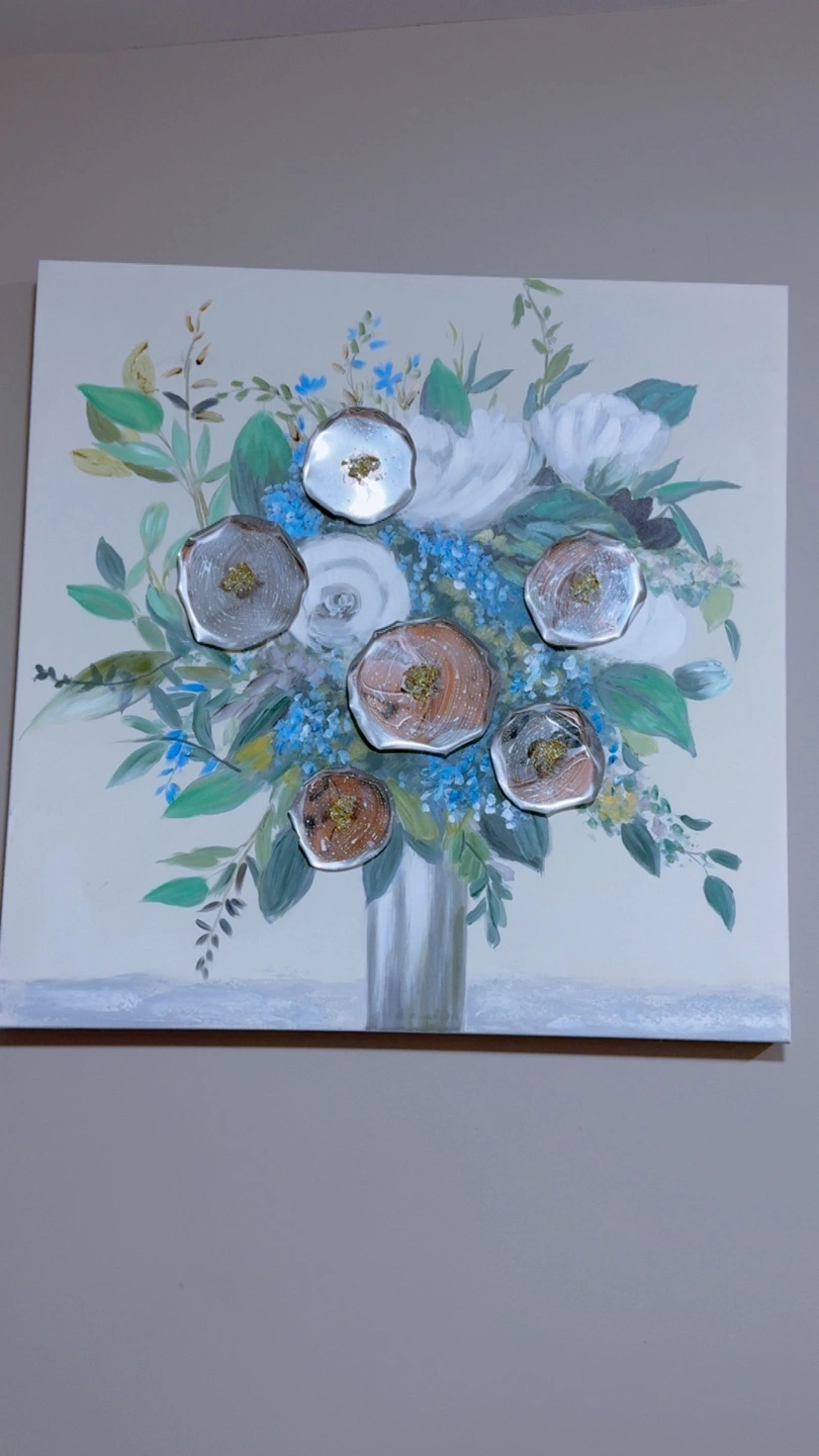 Beautiful painting of a floral bouquet in a vase. Features mixed media with painted flowers and resin accents. Perfect for adding a touch of elegance to any room.