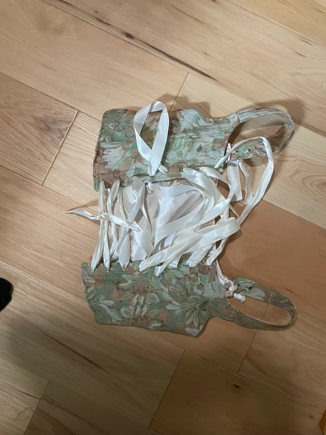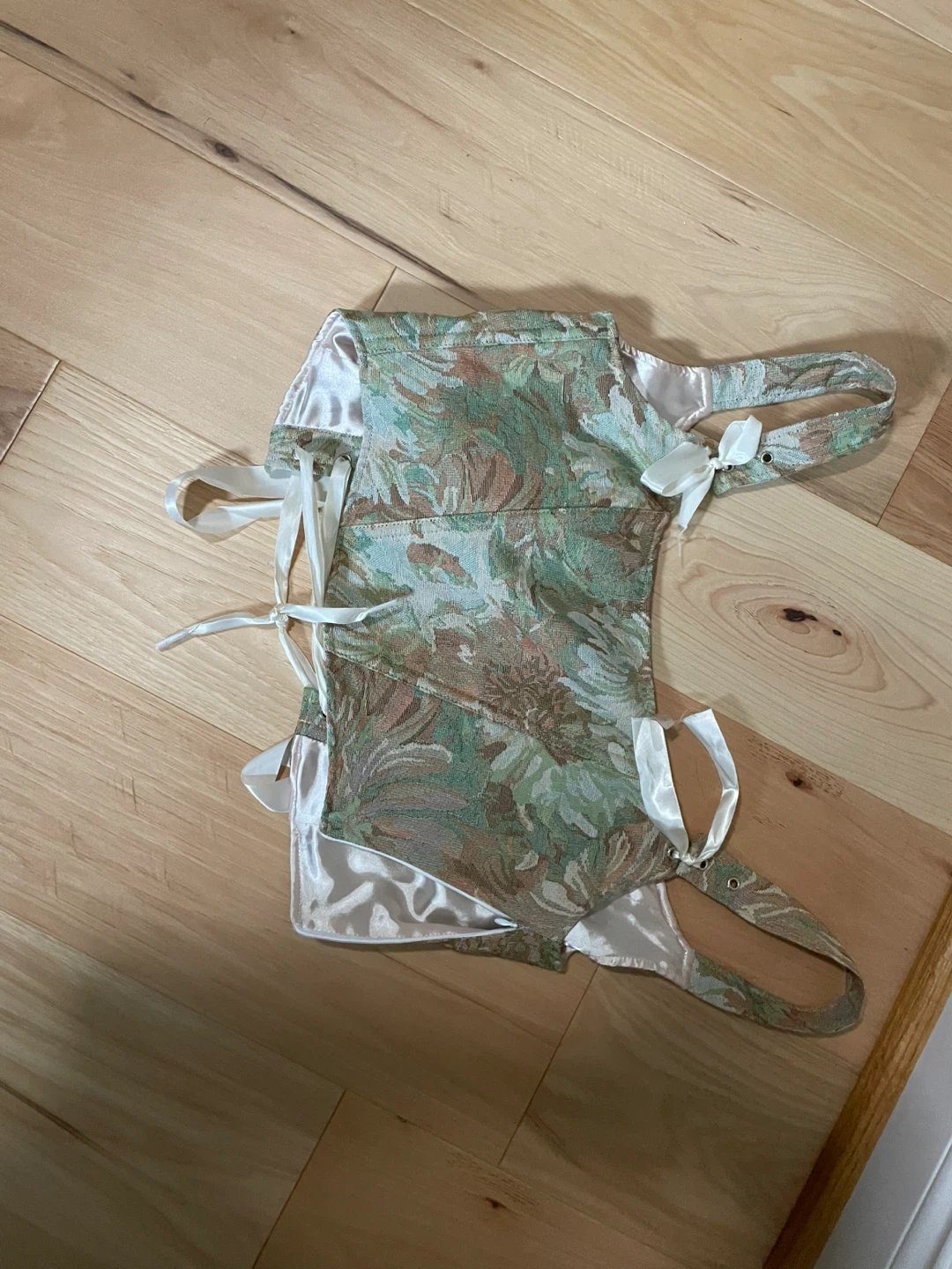 Selling a cute floral corset top! It has a unique design with white ribbon detailing. Perfect for adding a touch of elegance to any outfit