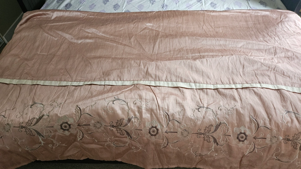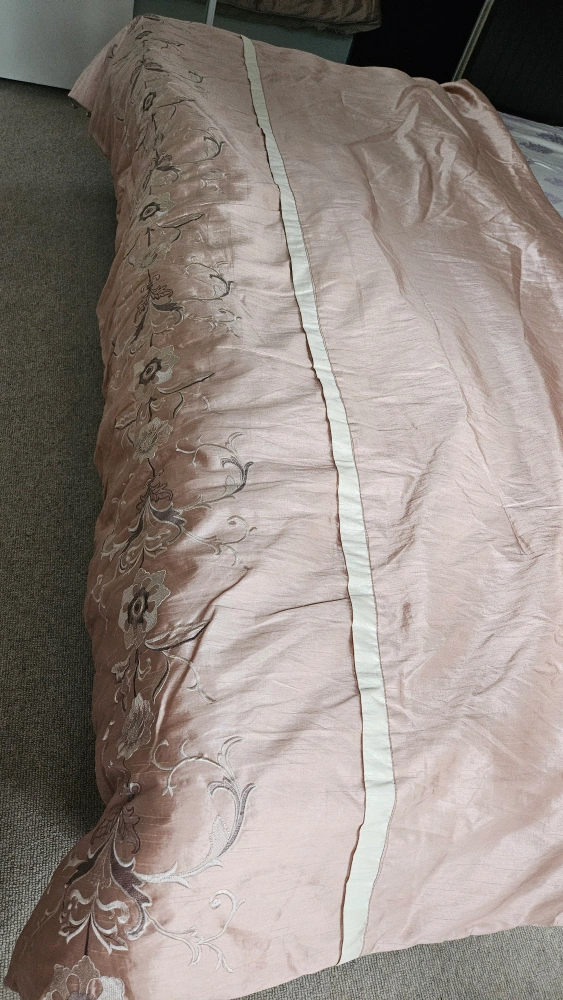 Selling a beautiful queen-size duvet cover with delicate floral embroidery. The material is a soft, light pink colour with a subtle sheen. It would add a touch of elegance to any bedroom!