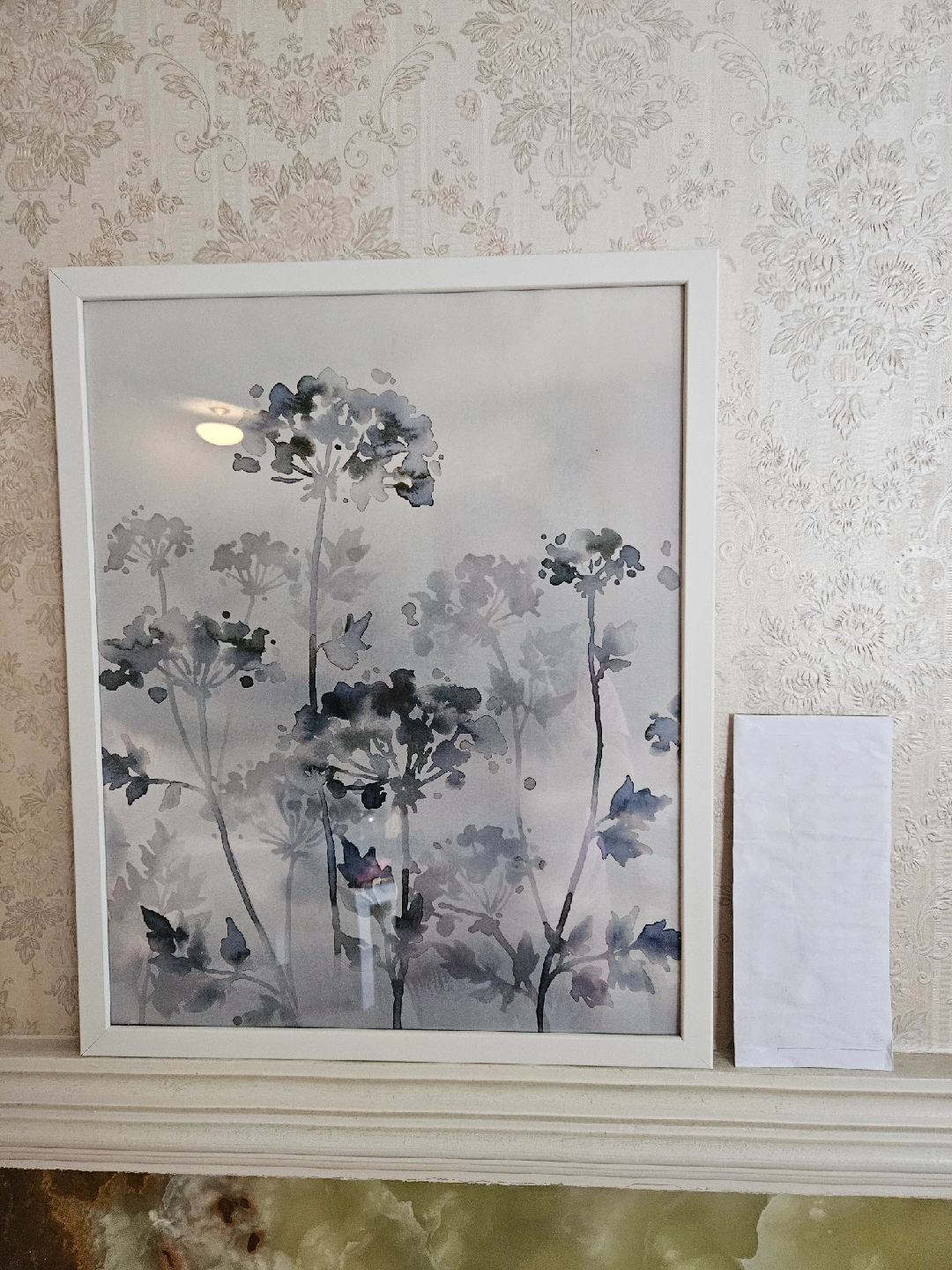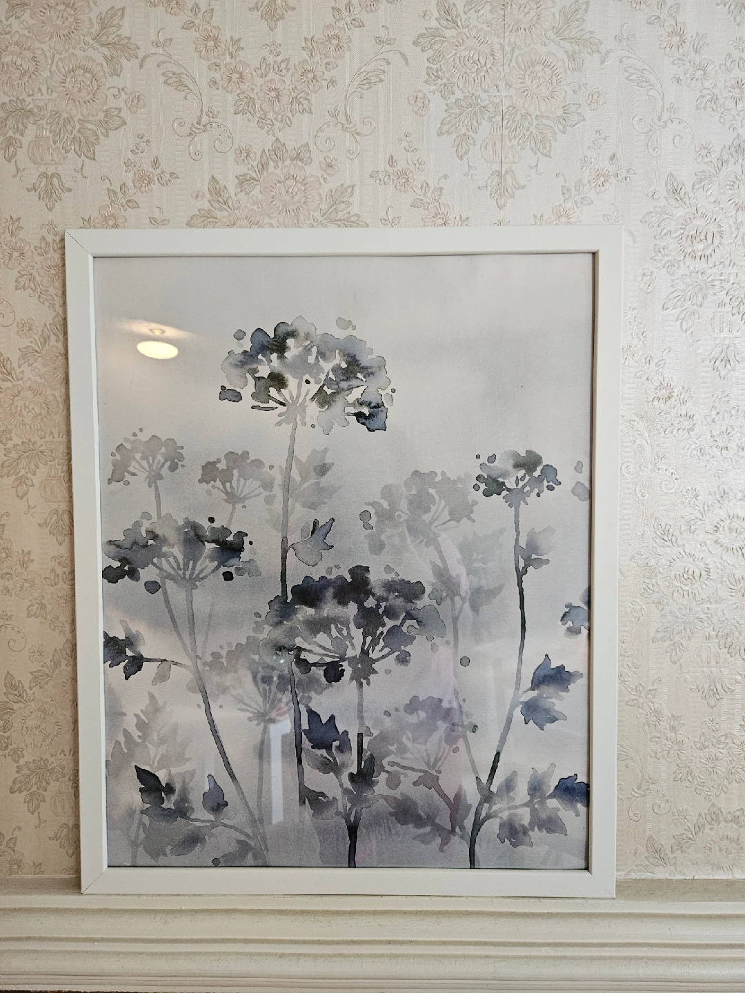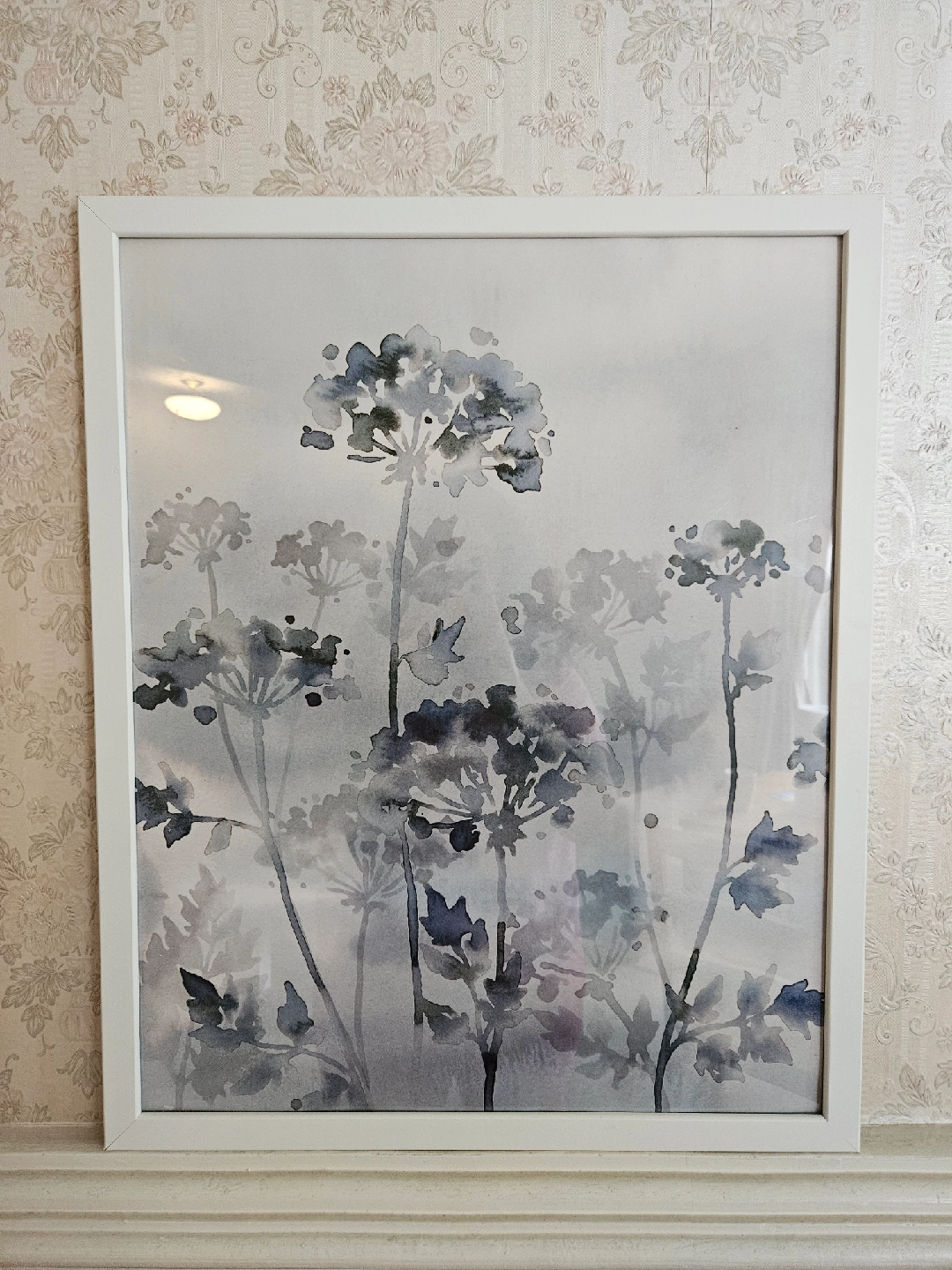 A lovely framed print featuring a delicate floral watercolour design. The frame is white, and the artwork has a calming, neutral palette that would complement any room. It's in great condition and ready to hang!