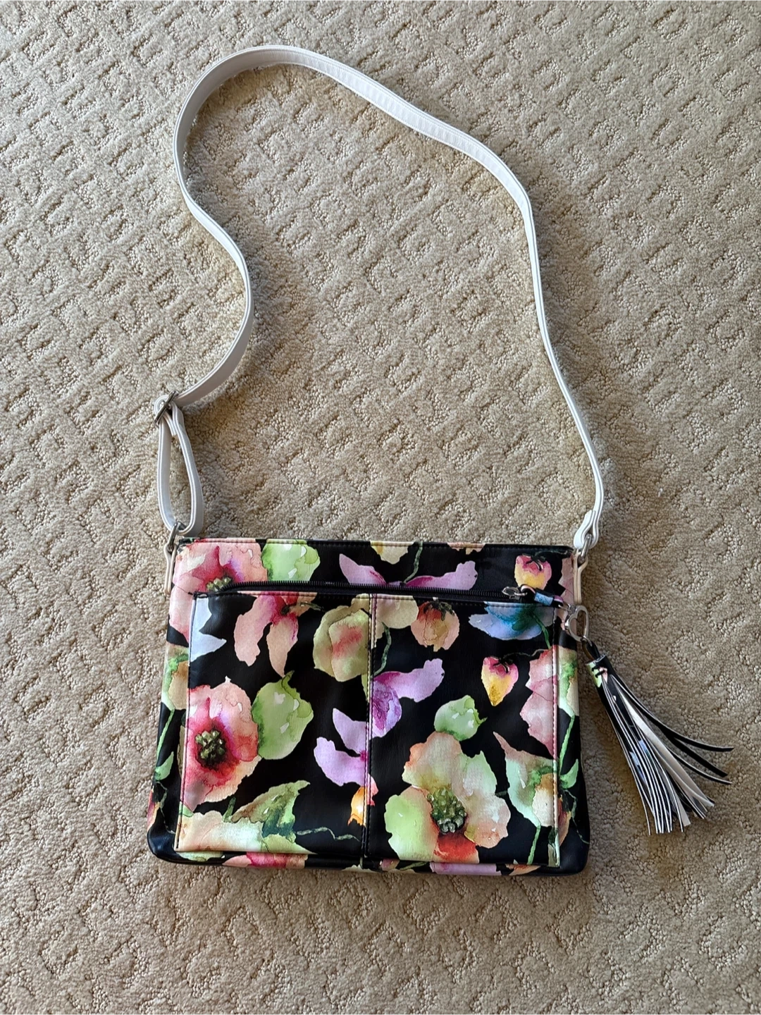 Floral handbag featuring a black background. The bag has an adjustable white shoulder strap and tassel detail on zipper pull. Lightly used, great condition. Appx 12” wide x 9” tall.