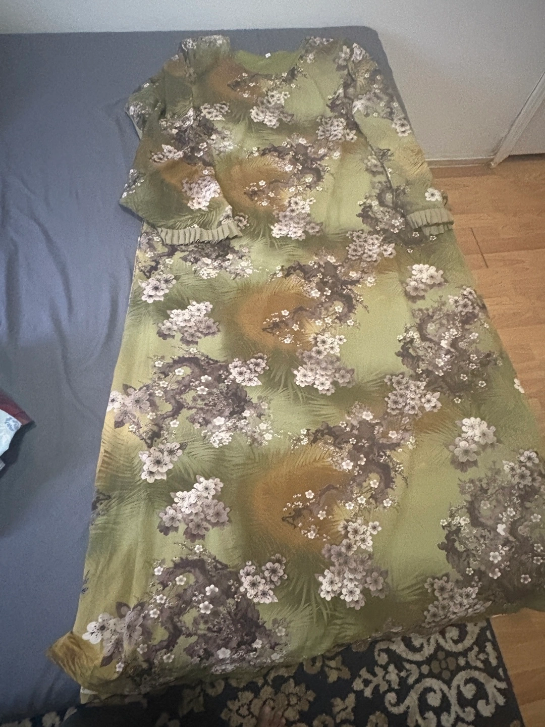 Long-sleeved maxi dress. Features a floral print in shades of green, brown and white. Long sleeves with gathered cuffs. Relaxed fit.