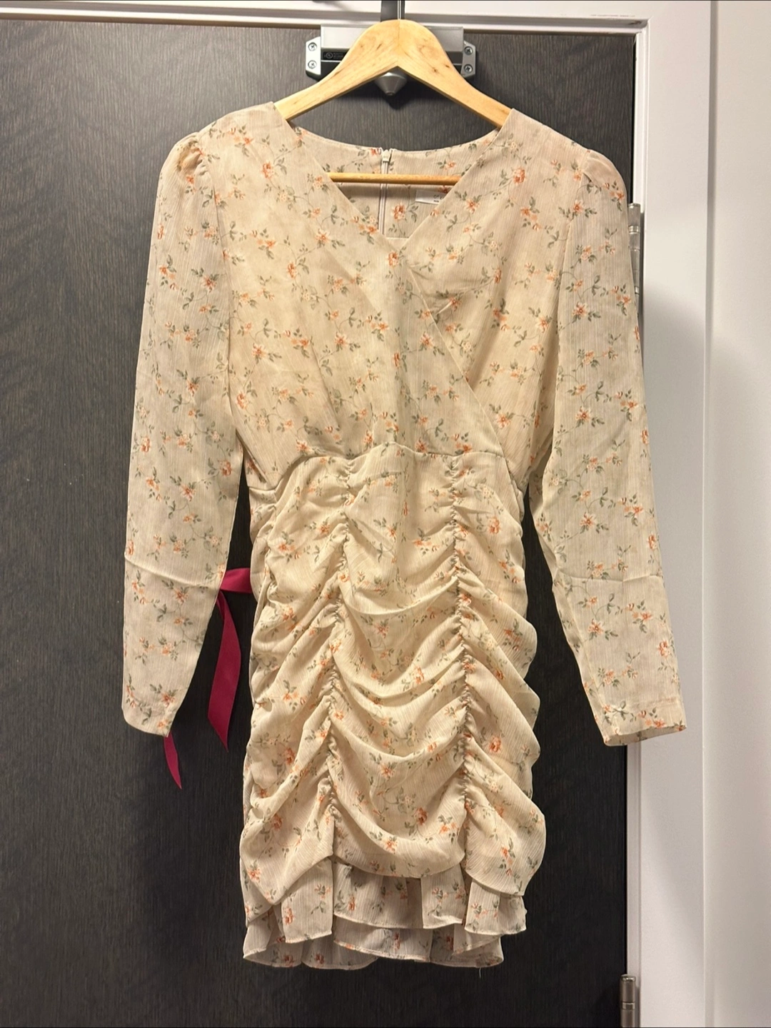 Adorable floral mini dress. Features three-quarter sleeves, a V-neckline, and a cinched waist. Ruched detailing throughout. Back zipper closure. Perfect for spring or summer.