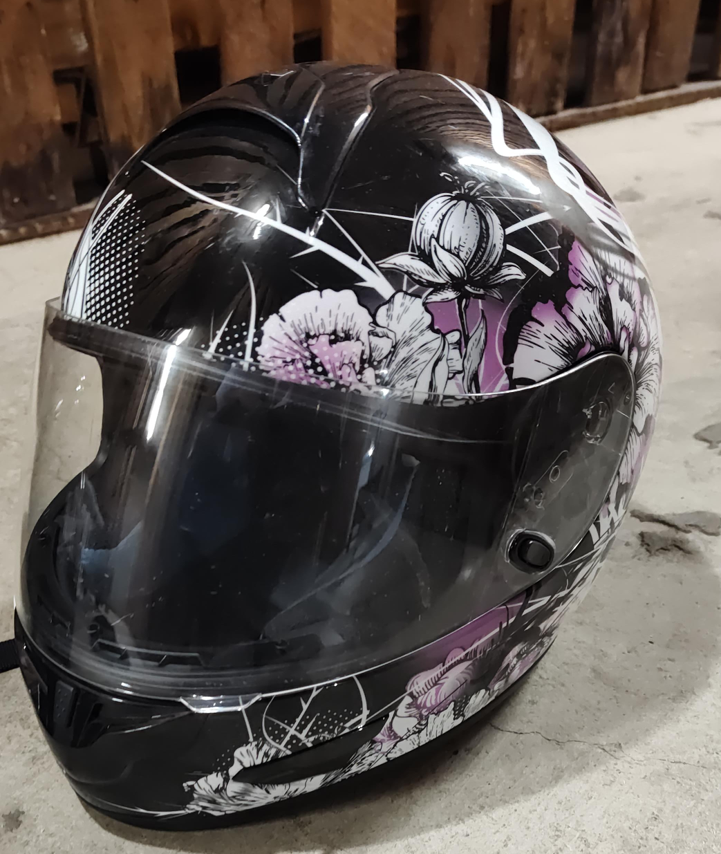 Selling a motorcycle helmet with a unique floral design! It's in great condition and ready for a new rider. Perfect for adding a touch of style to your rides!