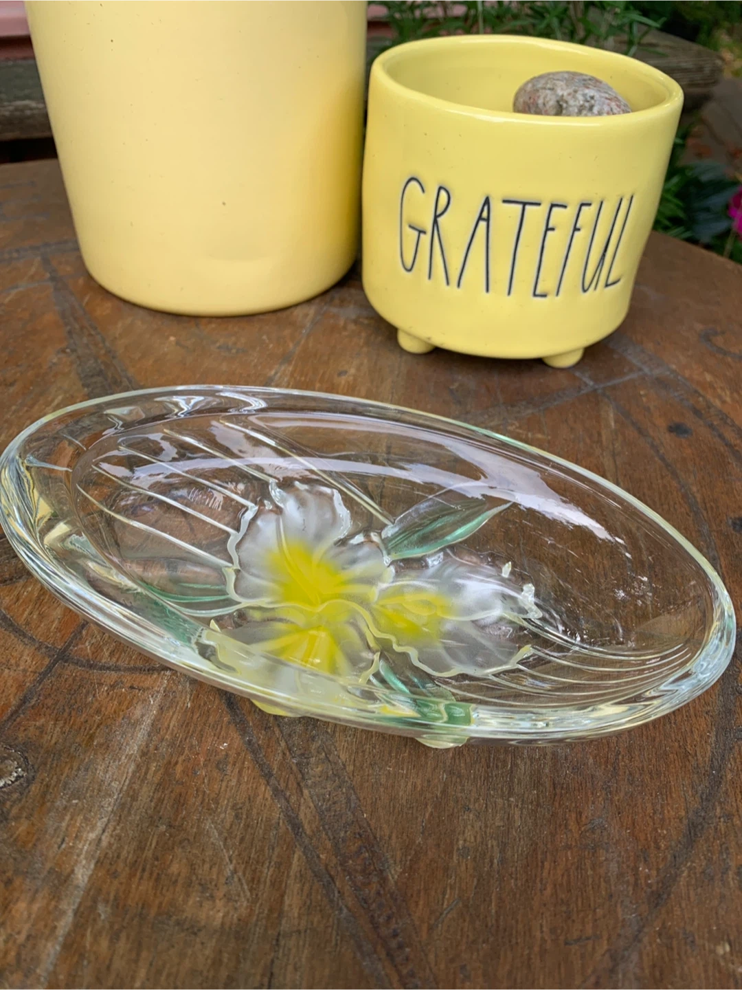 Selling a lovely floral orchid glass dish by Studio Nova Tender. It's in great shape and would look lovely on a coffee table or shelf. The floral orchid in yellow design is very pretty and the glass is clear and shiny. Perfect for adding a touch of elegance to your home decor. Could be used as a trinket dish, candy dish or even a soap dish! No chips or cracks in it. Cash only please. Props not included.