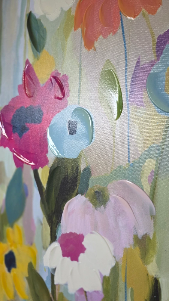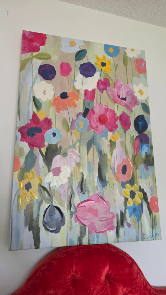 Beautiful floral painting on canvas, perfect for adding a touch of colour to any room! The painting features a variety of colourful flowers in shades of pink, blue, yellow, and white. The artist's signature is visible in the corner. Pick up at Delton area ______ SEE ALL MY ADS