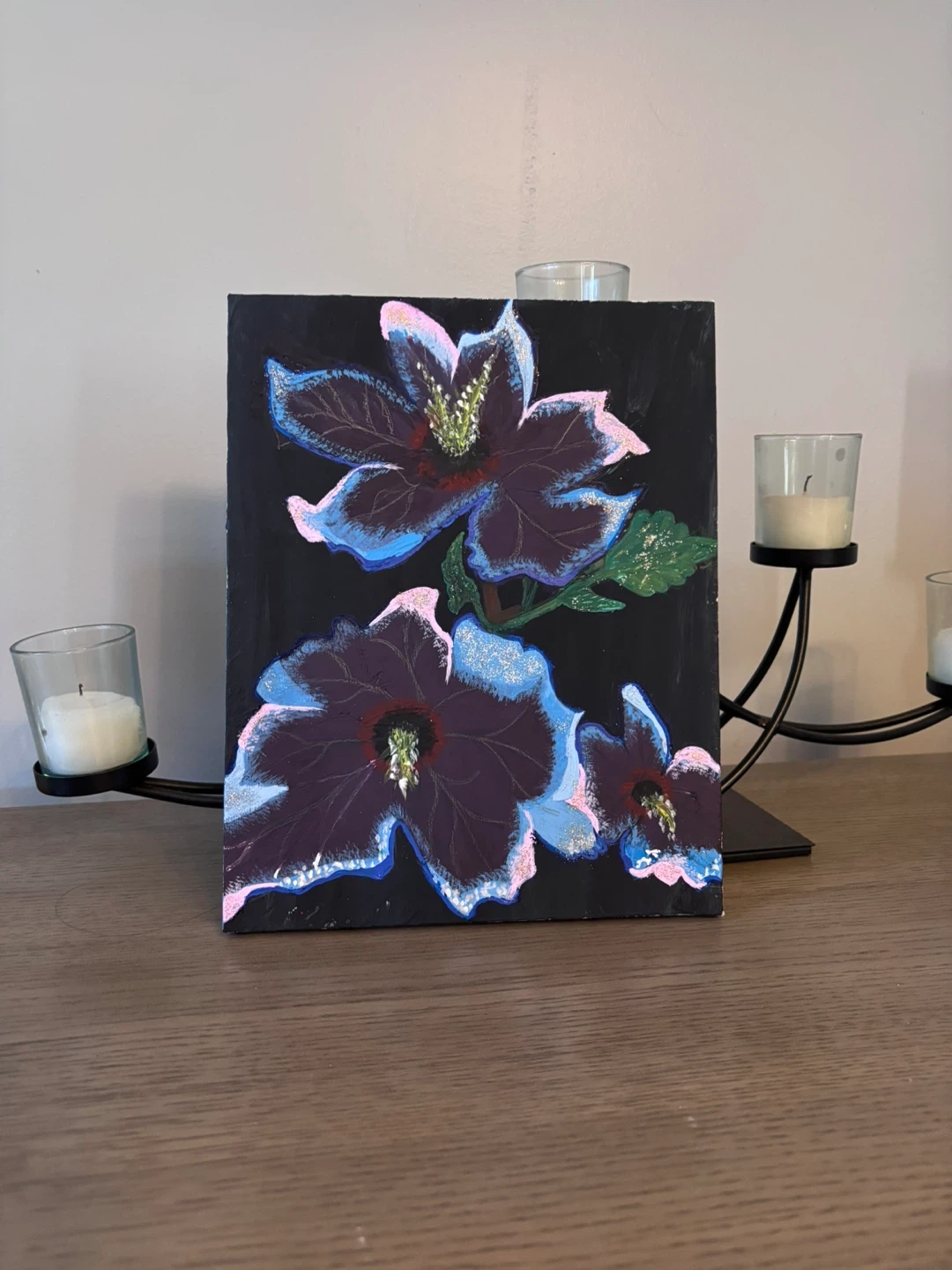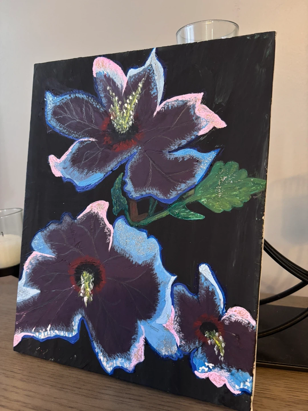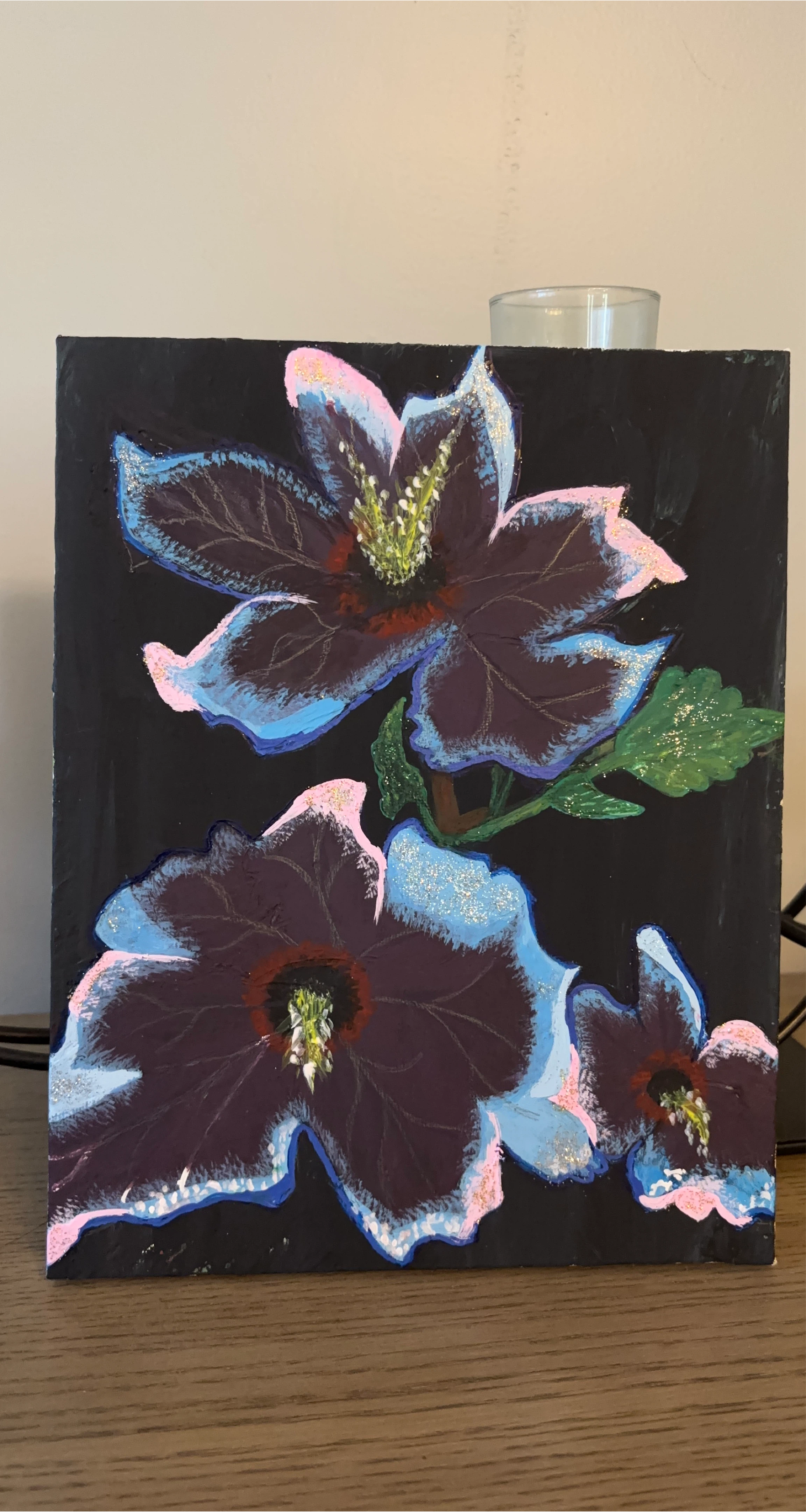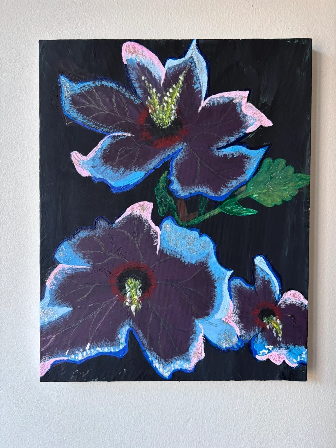 Original floral painting on canvas, featuring shades of blue, pink, and purple on a black background. This piece would add a touch of colour to any room