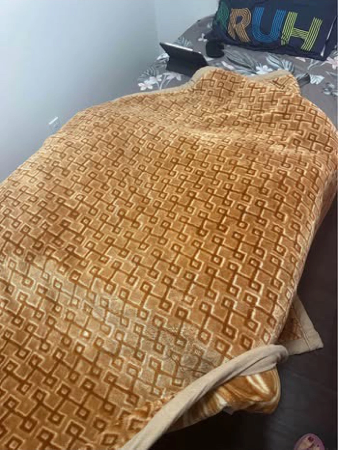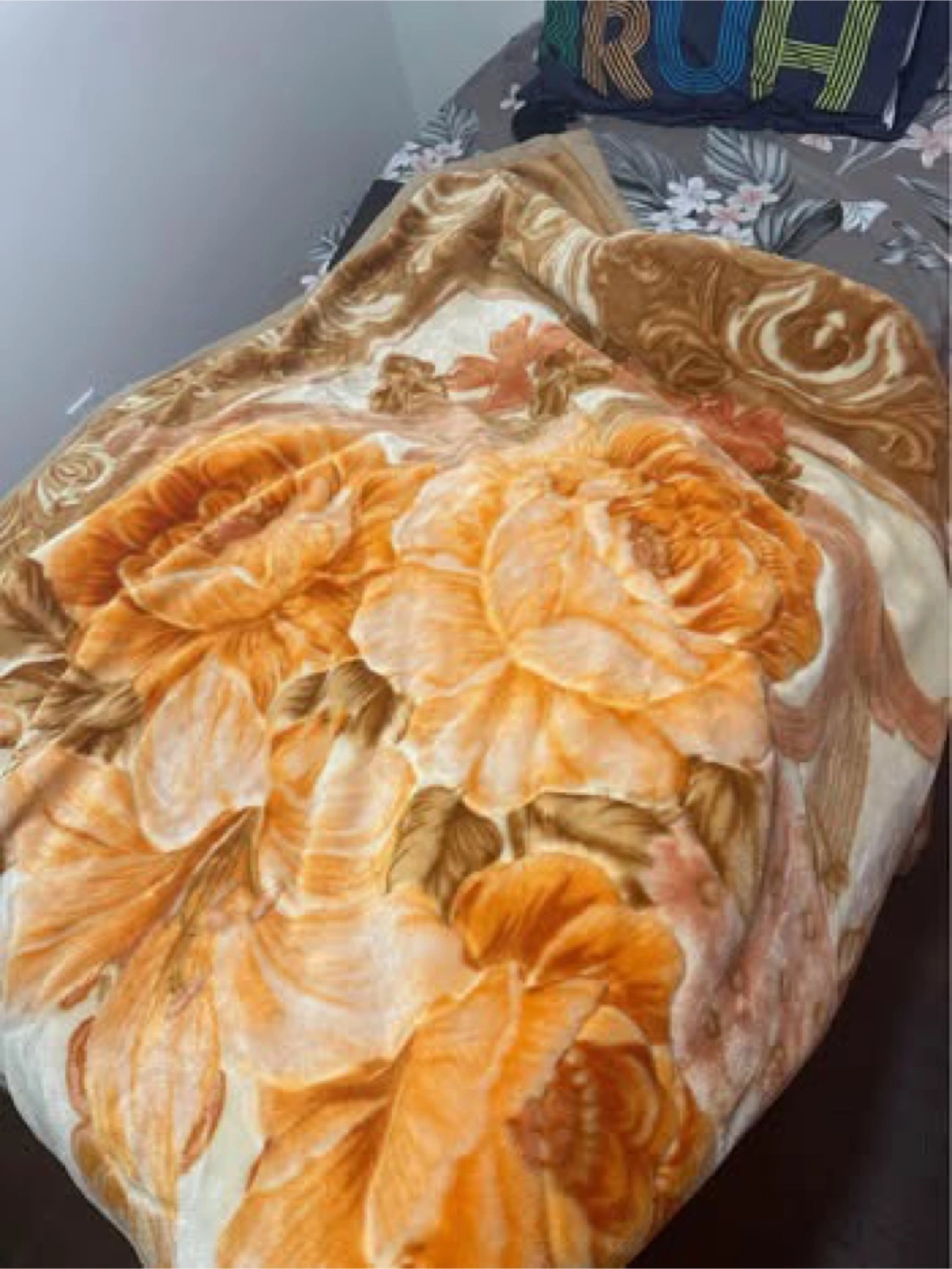 Selling a cozy blanket with a lovely floral pattern! It's in great condition and would be perfect for adding some warmth to your home. The colours are a mix of orange and brown, giving it a warm and inviting feel. It's a great size for snuggling up on the couch or adding an extra layer to your bed