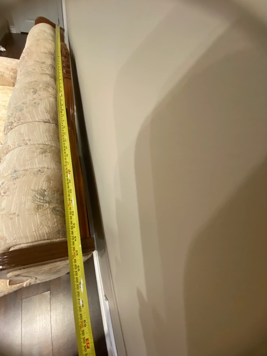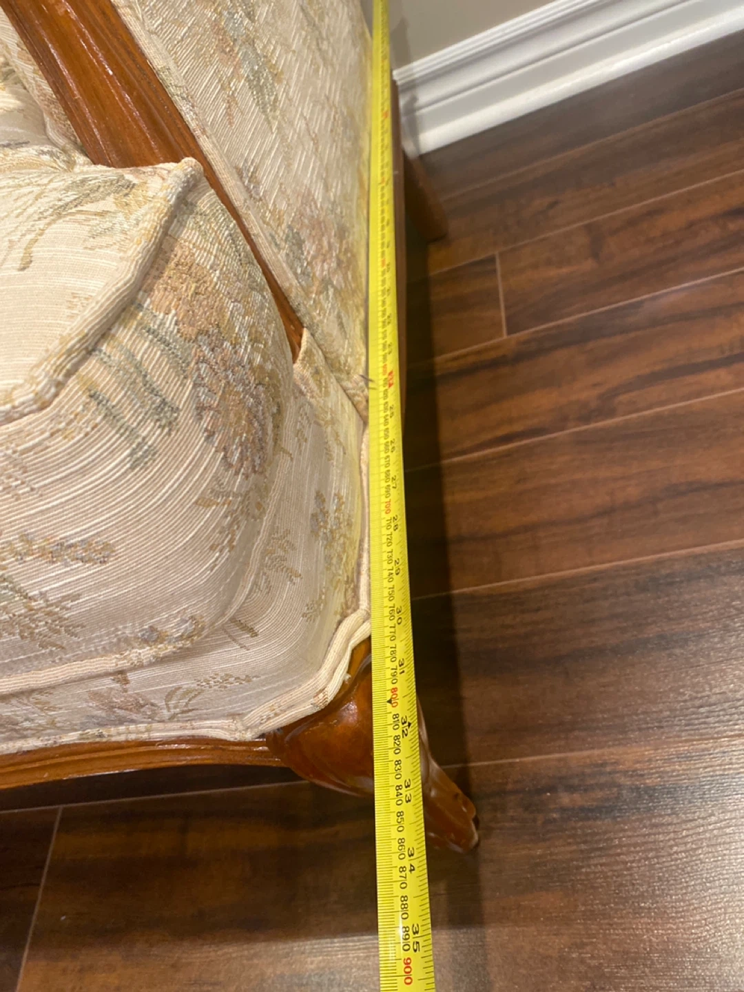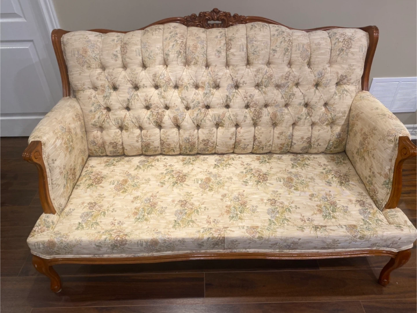 This is a lovely loveseat sofa with a floral pattern. It features a tufted back and wooden trim. The height of the sofa is approximately 33 inches. No pets and no smokers at home .
