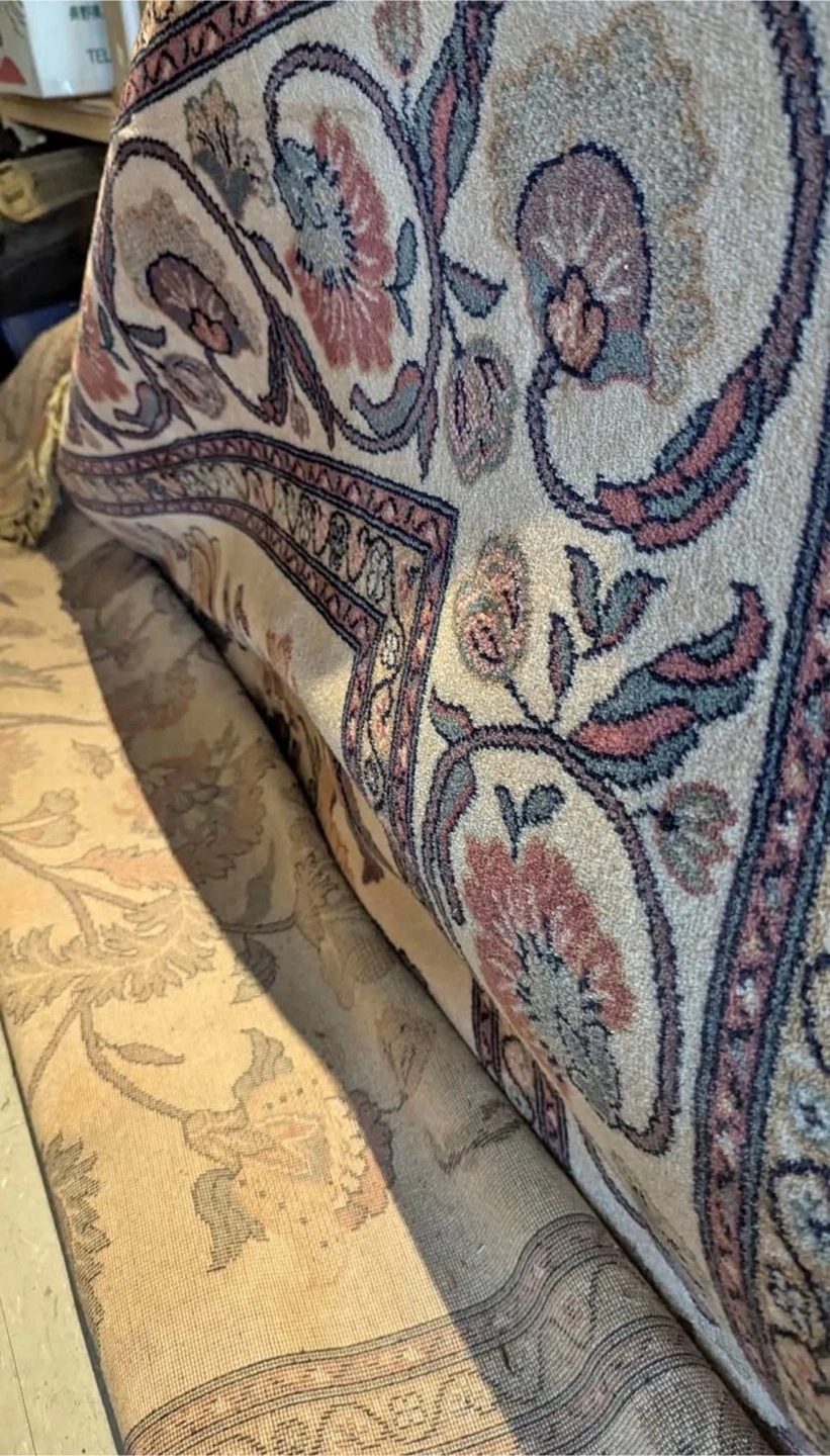 Here's a lovely massive belgium New Zealand wool area rug with a floral pattern! It's perfect for adding a touch of warmth and style to any room in your home. It's in good condition and ready for a new home! 98” wide, very long but would have to unroll to get the exact measurement - it’s huge!!
