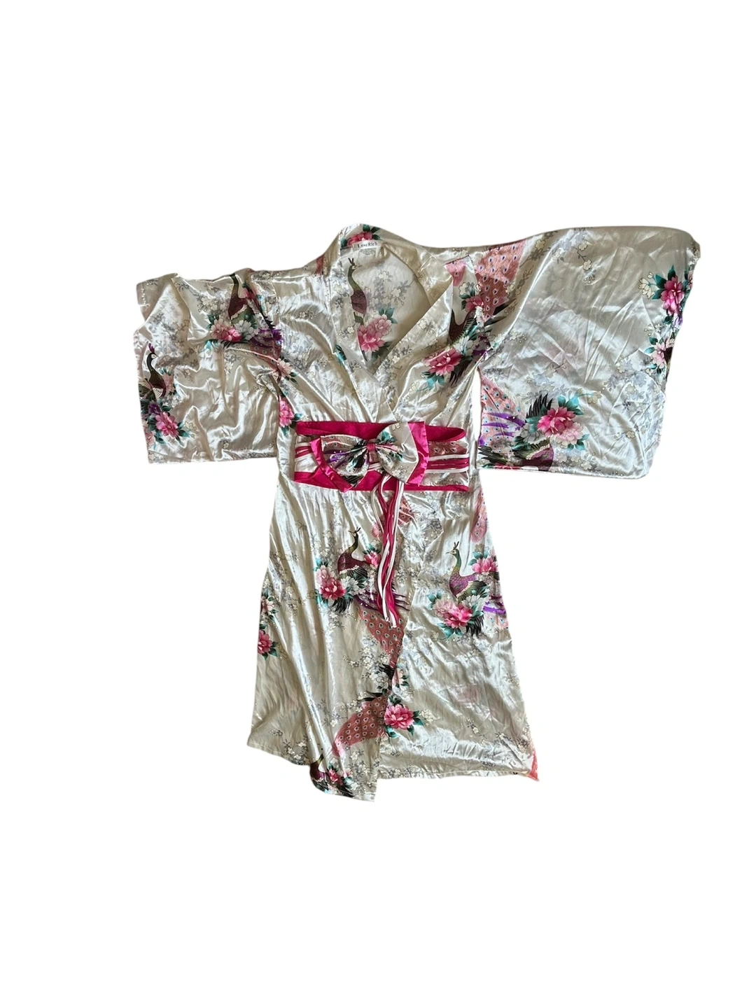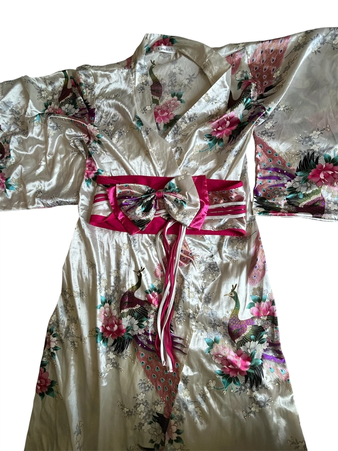 Selling a lovely kimono with a beautiful floral and peacock design. It's in good condition and would be perfect for lounging around the house or as a stylish cover-up. The material feels like satin, giving it a luxurious touch! It fits like a small or medium. Pickup is near Bathurst station.