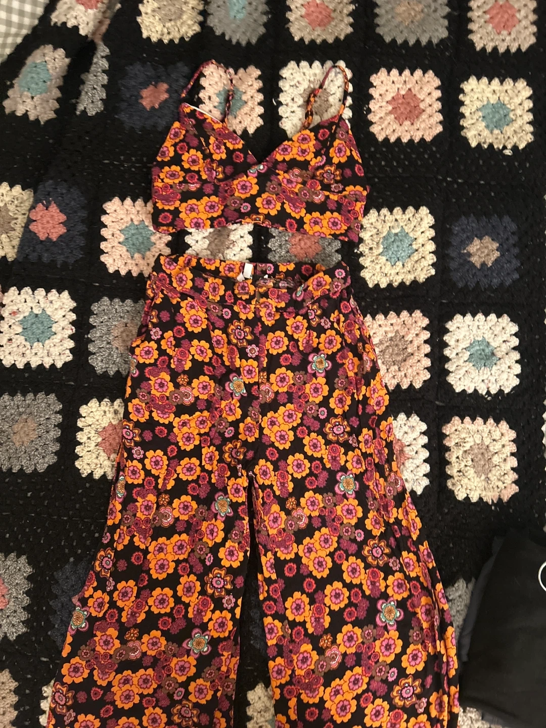 Selling a cute floral print bralette and pants set. The set is a vibrant mix of black, orange, and pink floral patterns. Perfect for a stylish and comfortable look!