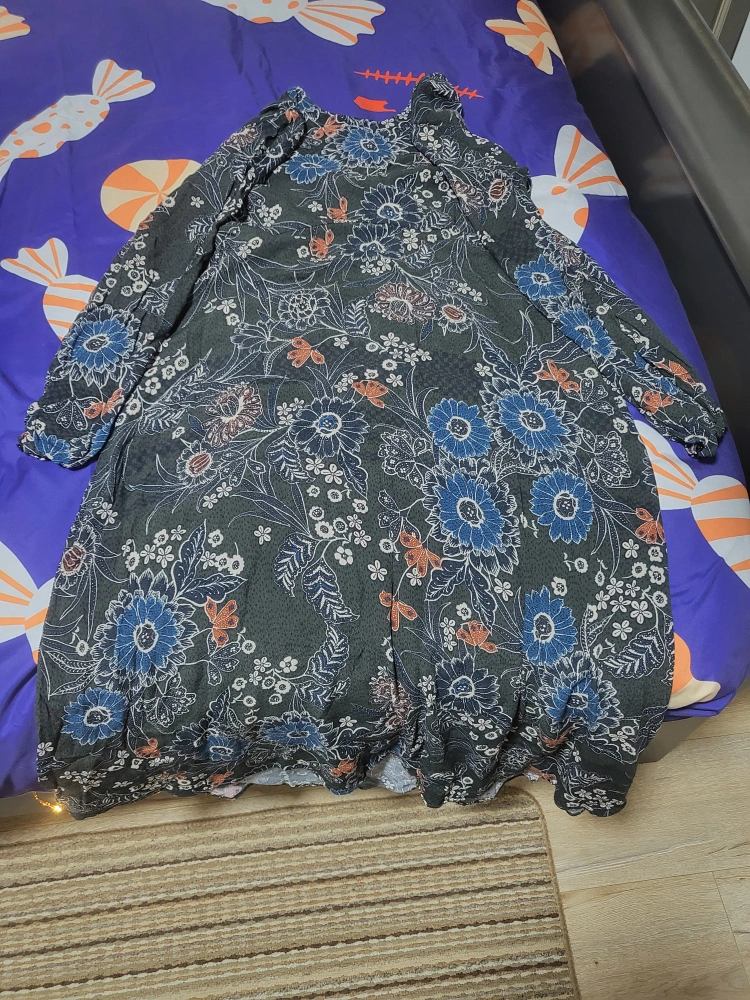Here's a lovely dress with a floral print! It features a dark background with blue, white, and orange flowers. It's in great condition and ready for a new home