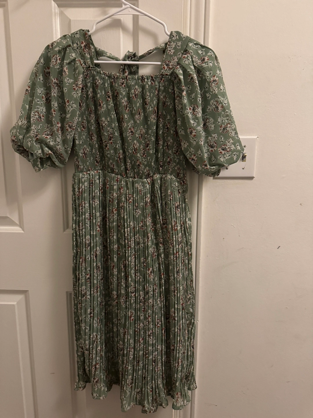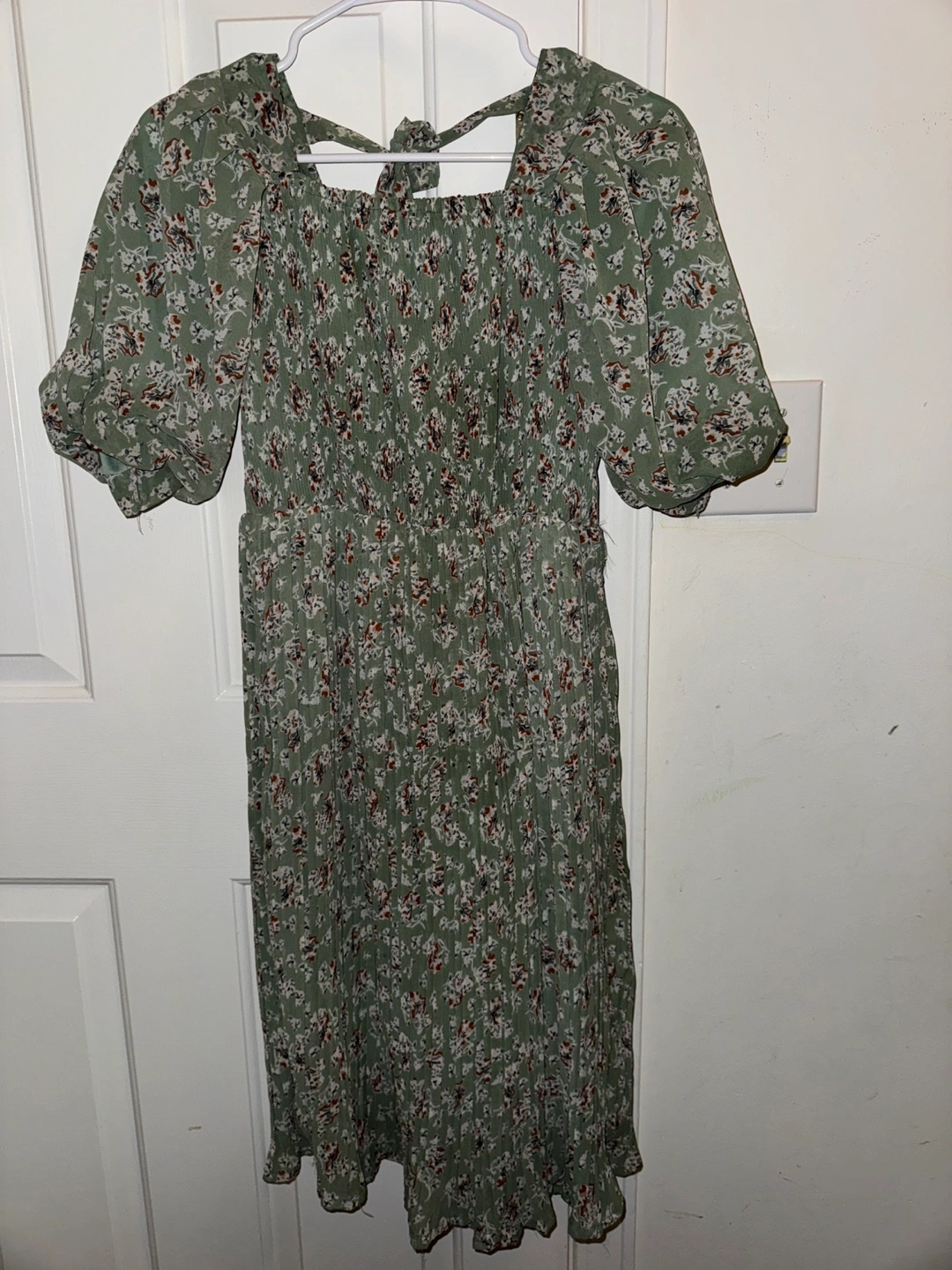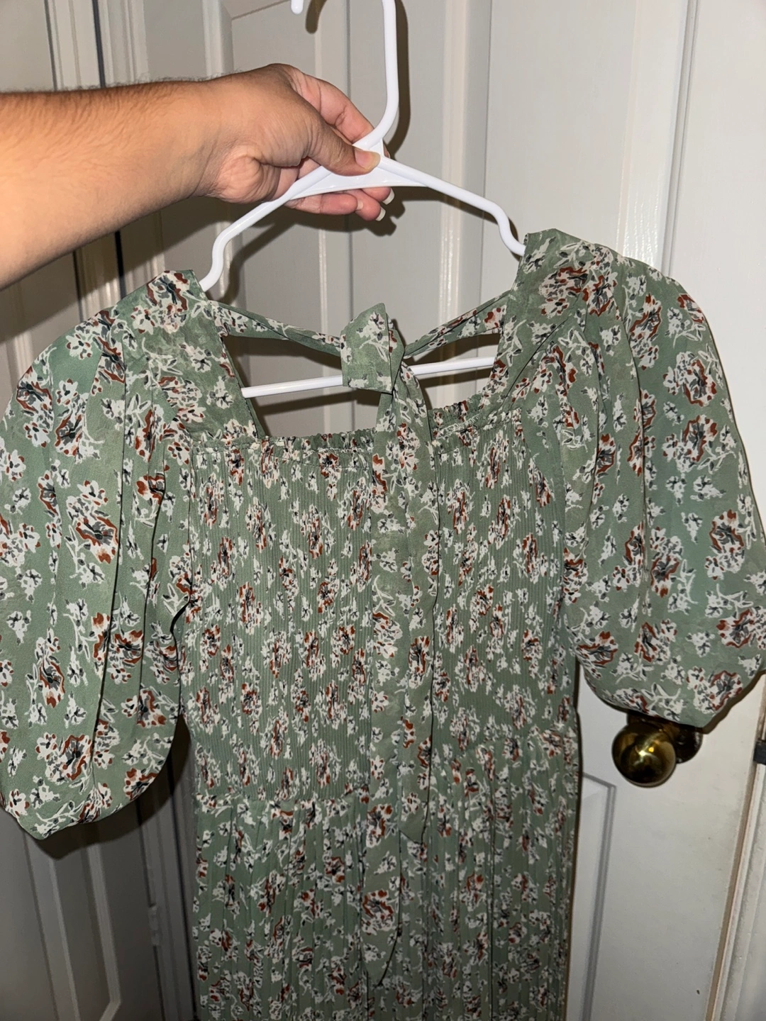Selling a cute floral print dress in a lovely green colour! It's in great condition and features a flattering square neckline and puff sleeves. Perfect for a sunny day out or a casual gathering