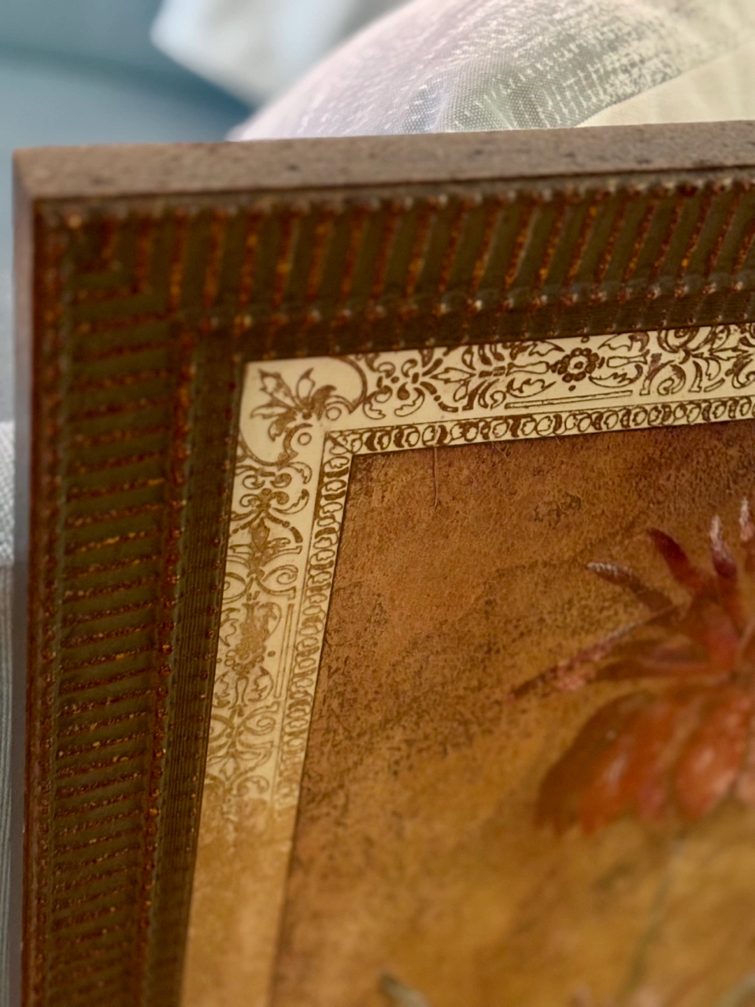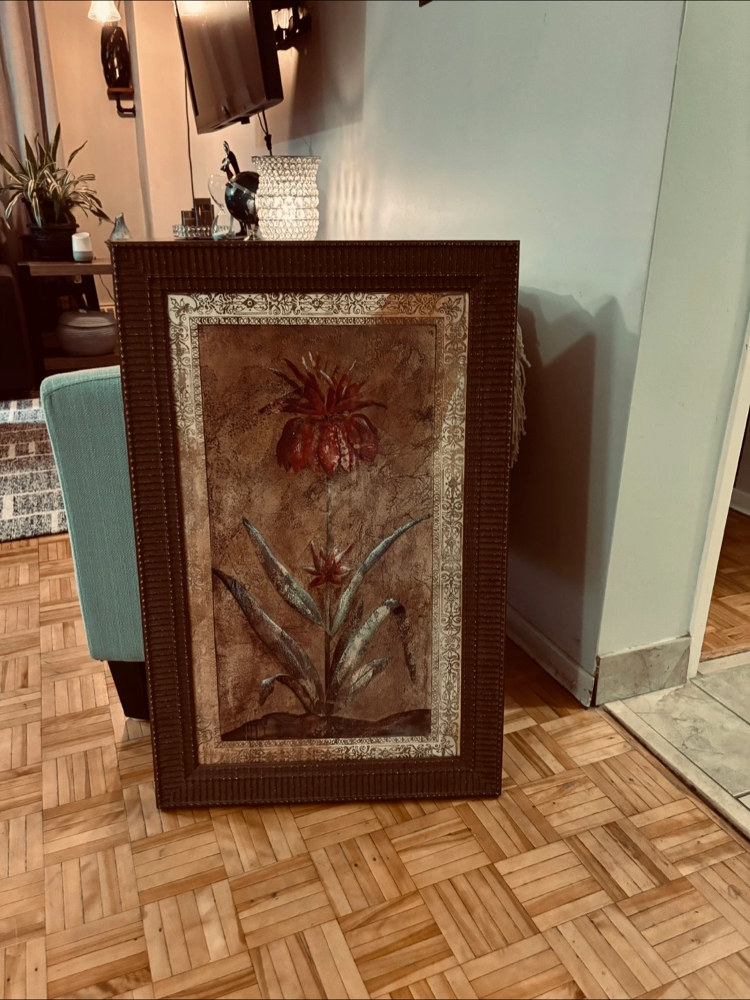 Selling a framed piece of wall art featuring a floral print. The frame has a detailed, textured design. It's in good condition and would add a nice touch to any room