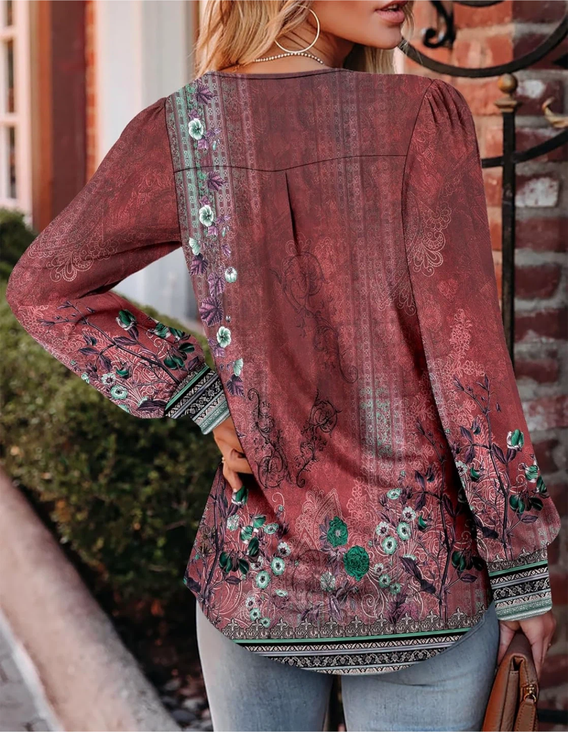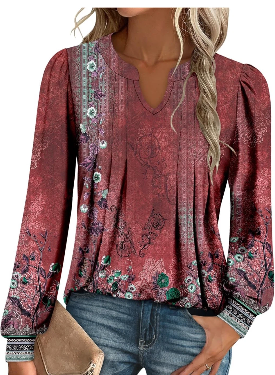 Here's a lovely floral print long sleeve blouse! The design features beautiful floral patterns in shades of red, green, and purple. It's perfect for adding a touch of elegance to your wardrobe