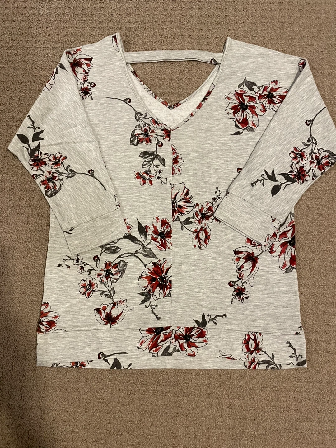 Cozy long sleeve top with a lovely floral print! It features a unique V-neck design with an open back detail. Perfect for adding a touch of spring to your wardrobe, even on cooler days. New without tag