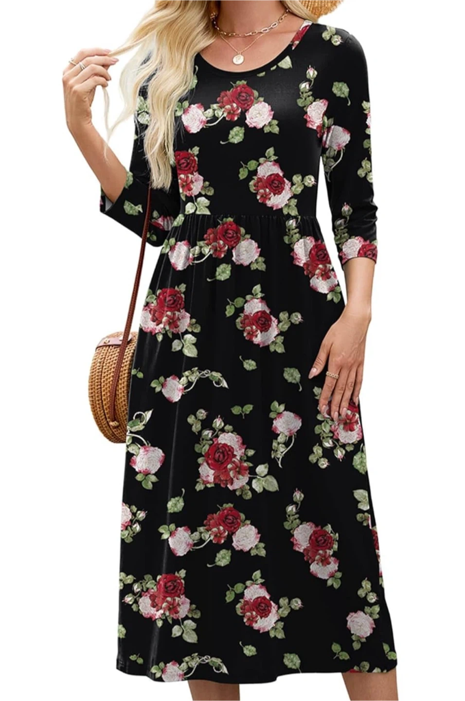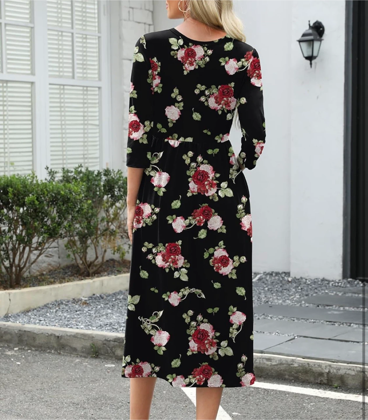 This is a lovely black midi dress with a beautiful floral print featuring red and white roses. It has three-quarter sleeves and a comfortable fit. Perfect for a casual day out or a special occasion!