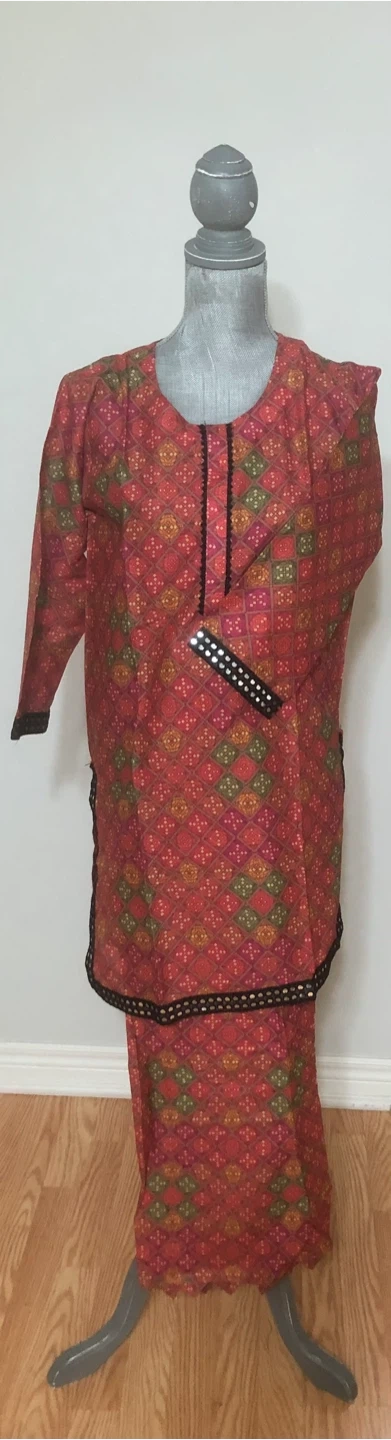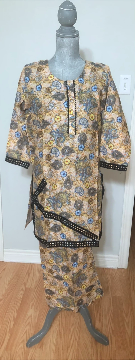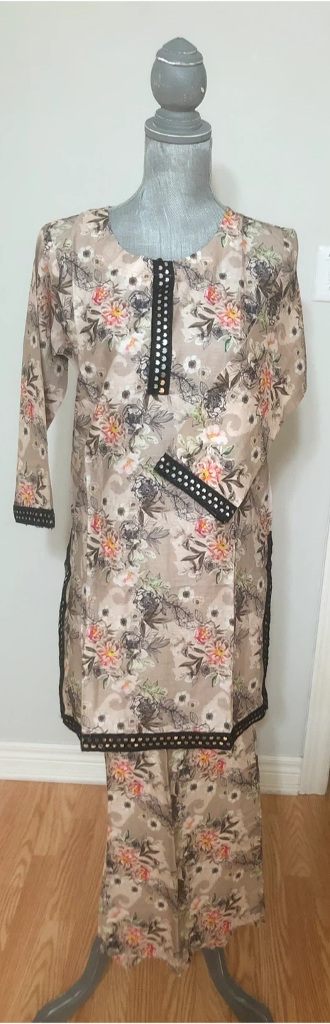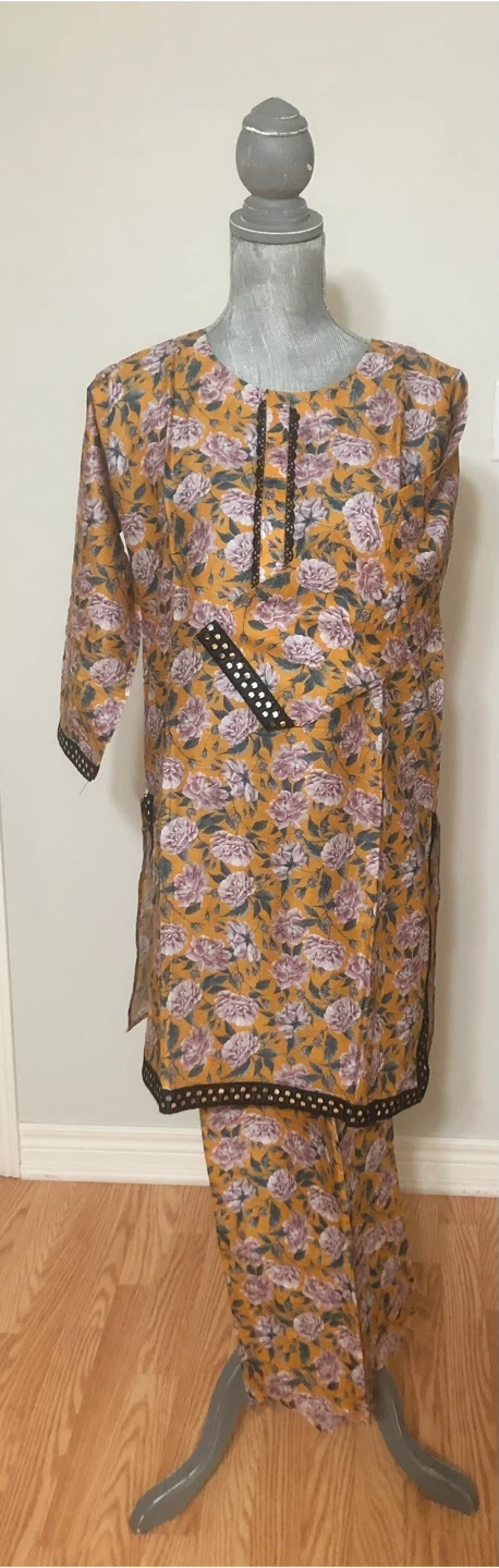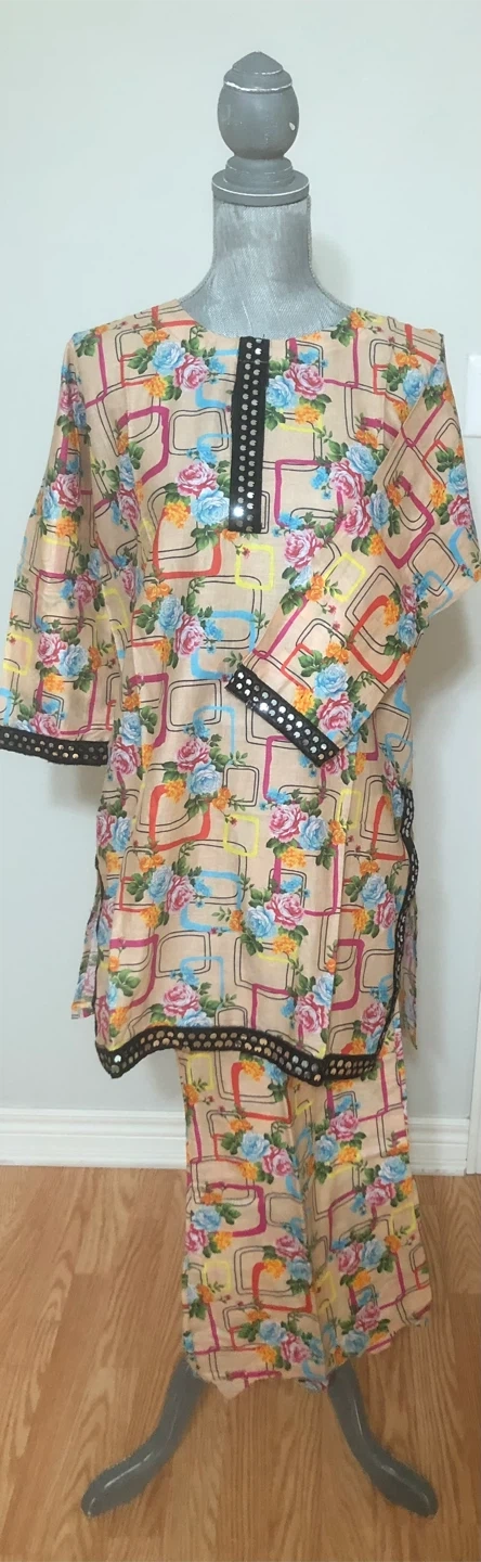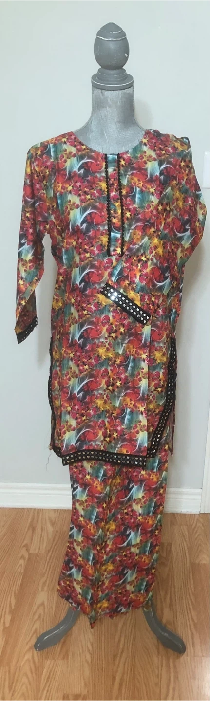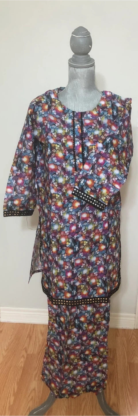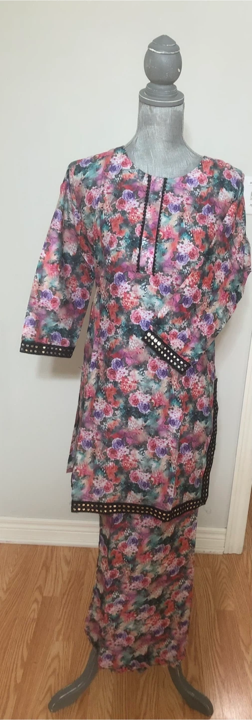 Selling a lovely salwar kameez suit set with a unique floral print! The material is lightweight and comfortable, perfect for warmer weather. The set includes a short tunic top and matching pants. The intricate detailing around the neckline and sleeves adds a touch of elegance to this traditional outfit. Pickup Milton