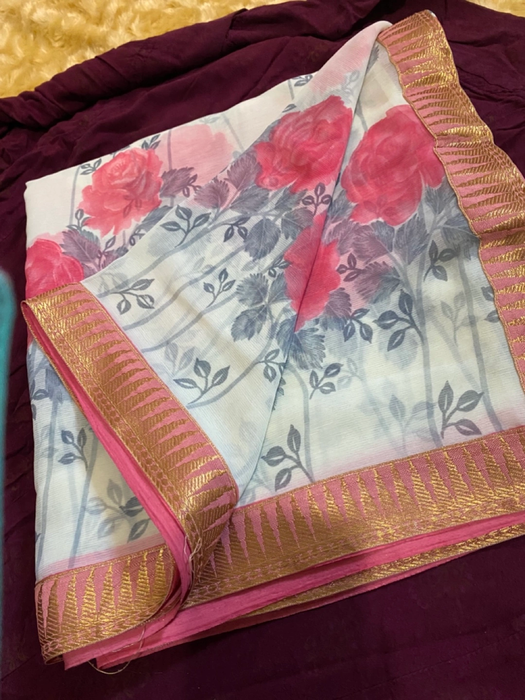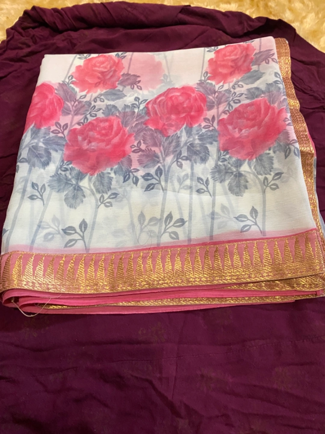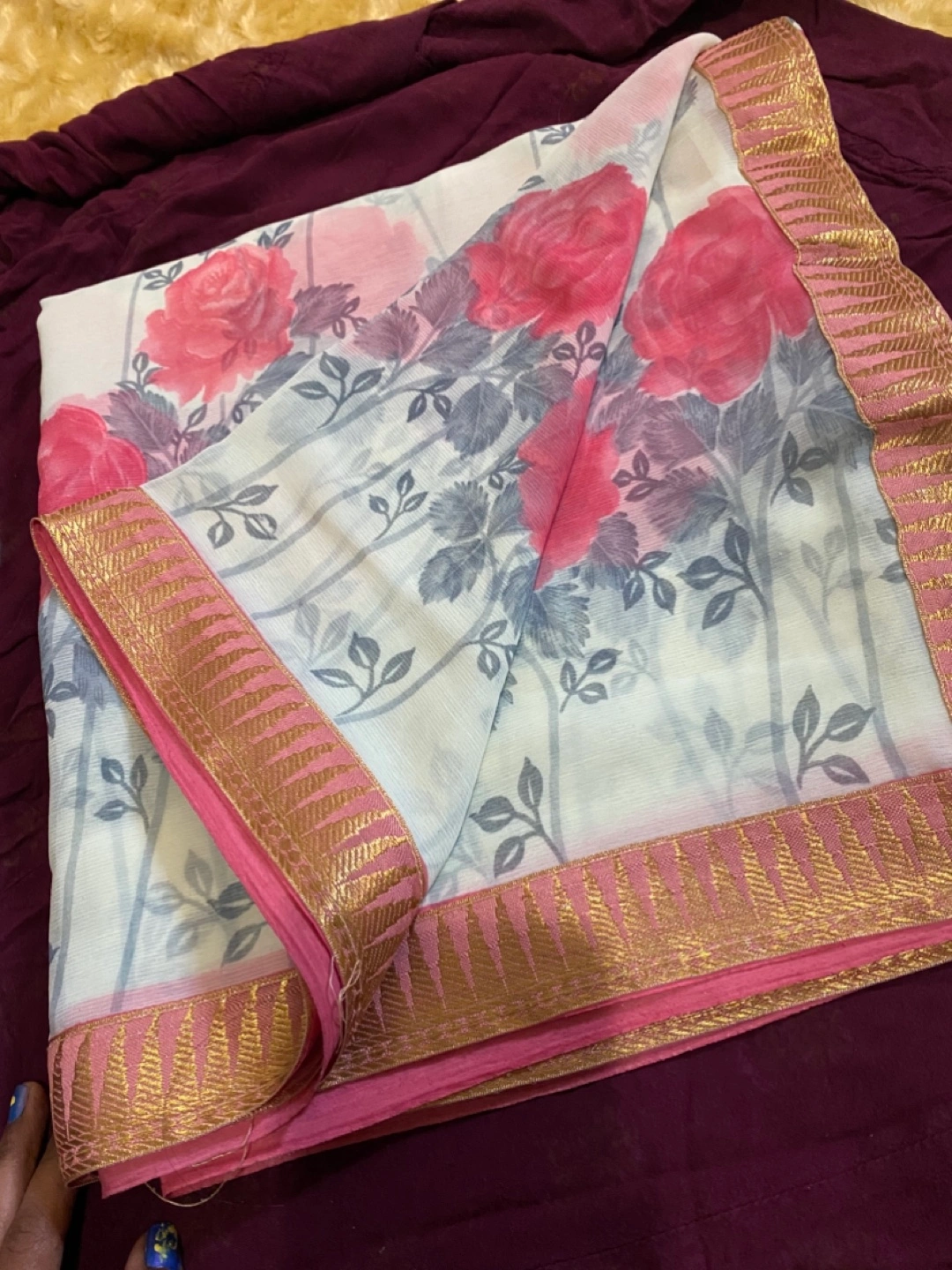 Beautiful saree featuring a floral print with pink and grey leaves. The border is a lovely combination of pink and gold, adding a touch of elegance. Perfect for a special occasion or everyday wear!