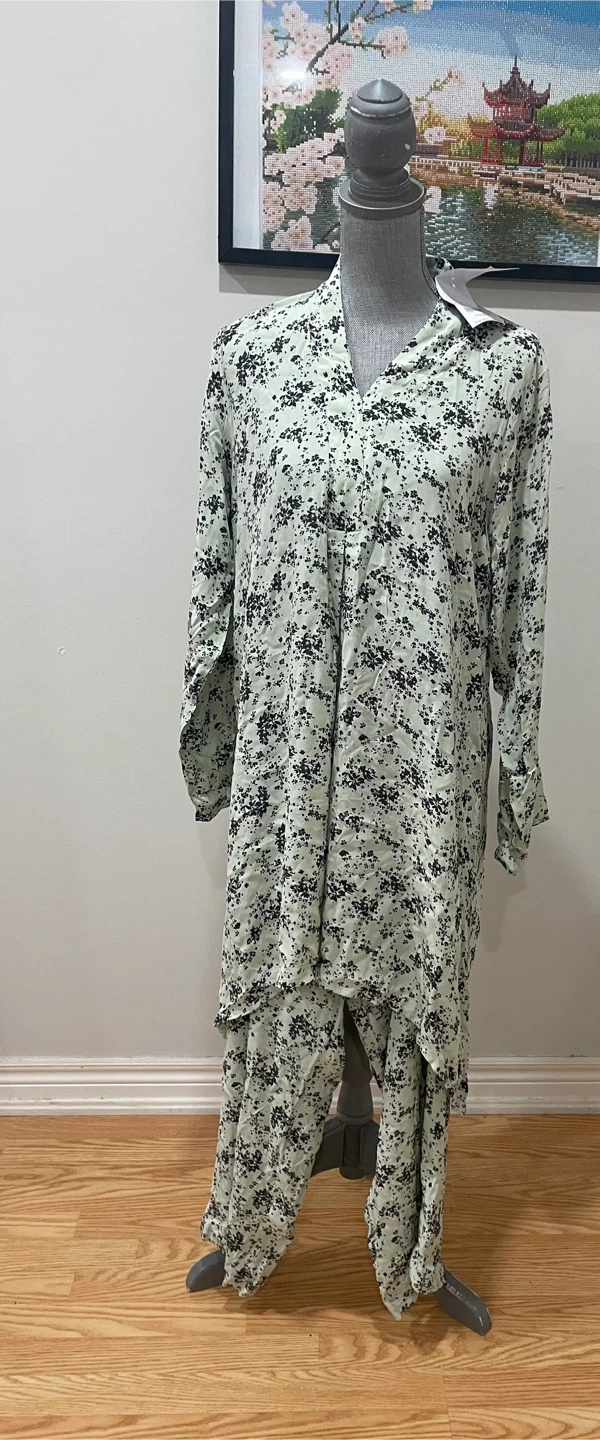 Selling a cute coored set in a light mint green colour with a dark floral print. It includes a long-sleeved top and matching pants. Size large. Material georgette. Size large price $25. Pickup Milton