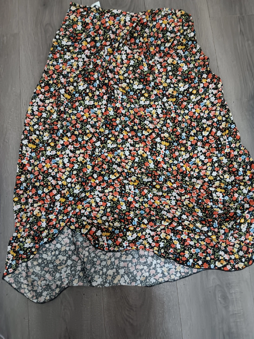 Selling a skirt with a fun floral print! It features a black background with small red, yellow, blue, and white flowers. The skirt has a slight high-low hem. Perfect for adding a pop of colour to your wardrobe!