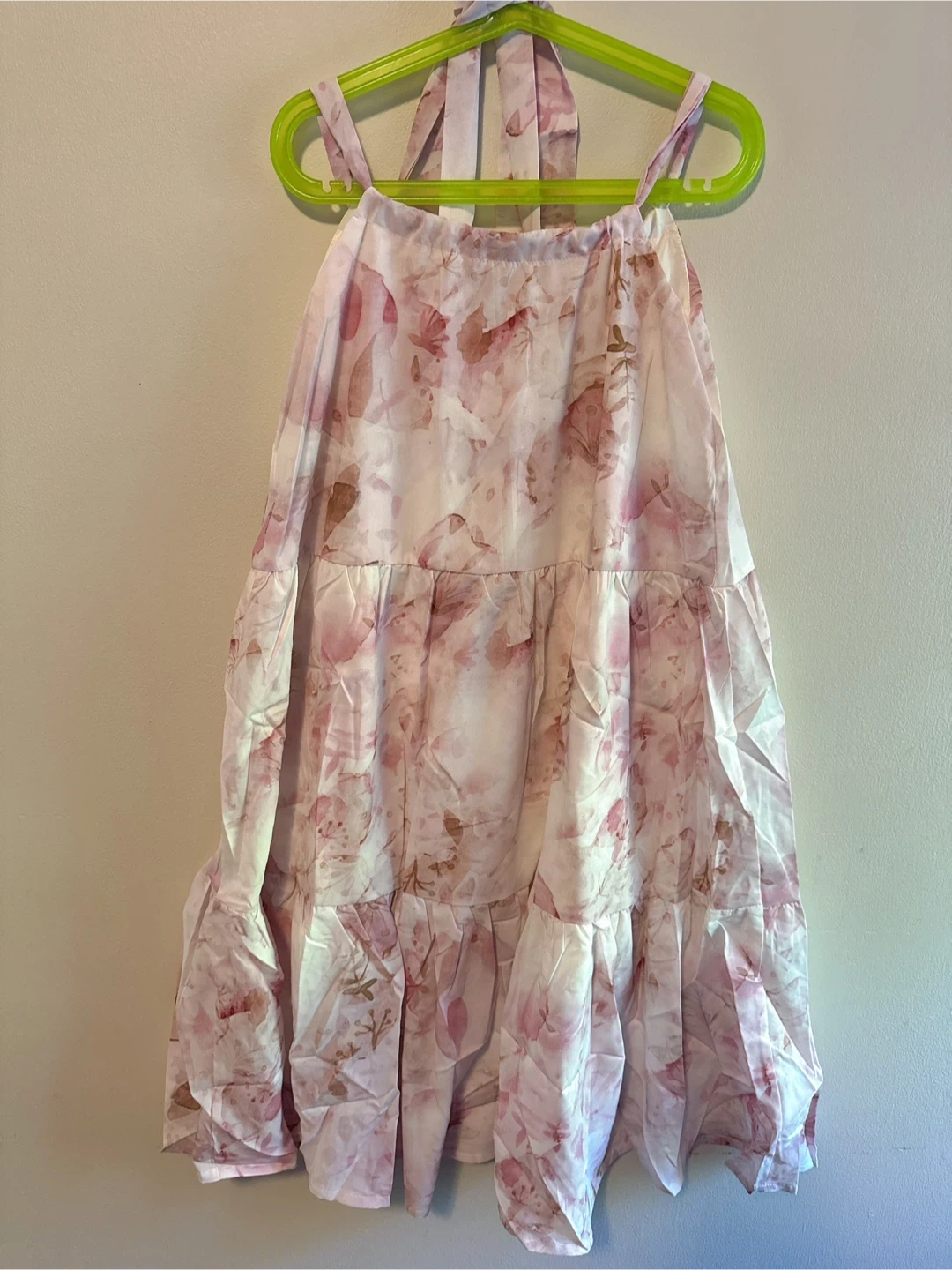 Selling a cute floral print sundress. It's in great condition and perfect for summer days! The dress features a tie halter neck and a tiered skirt. Length adjustable.