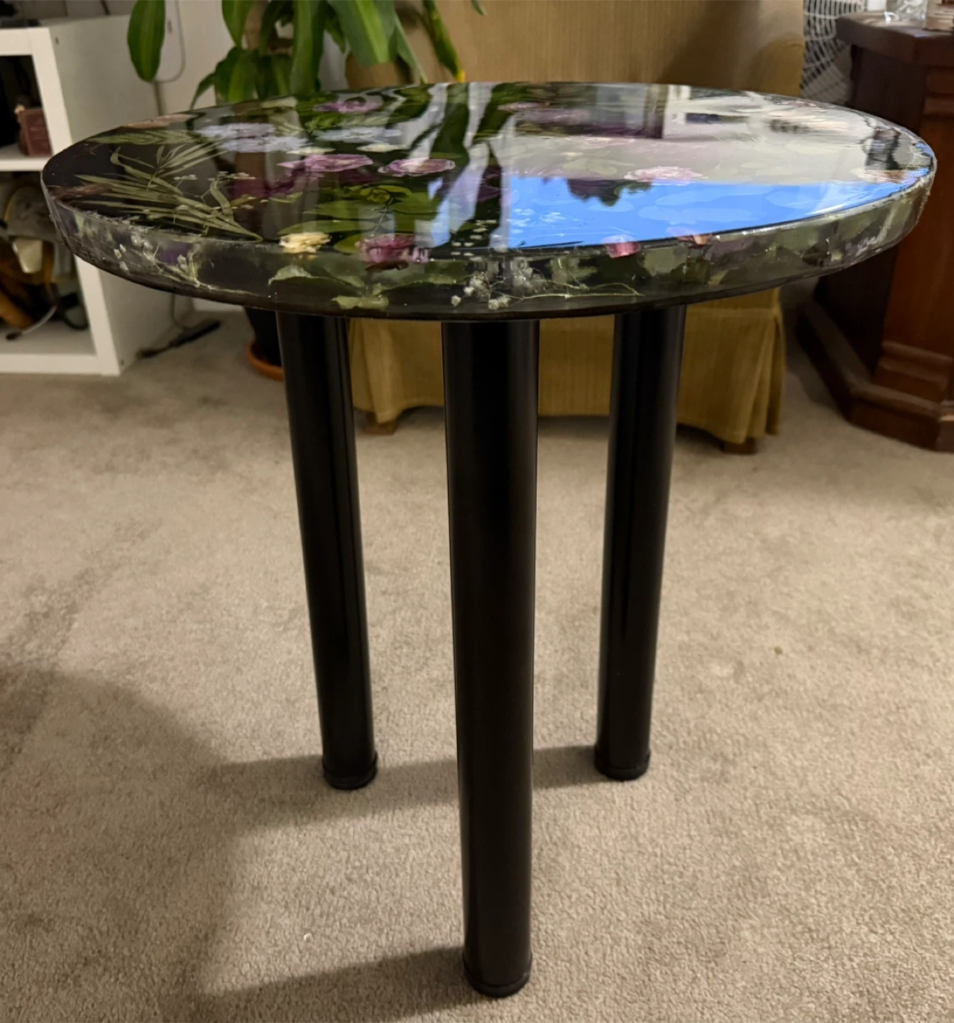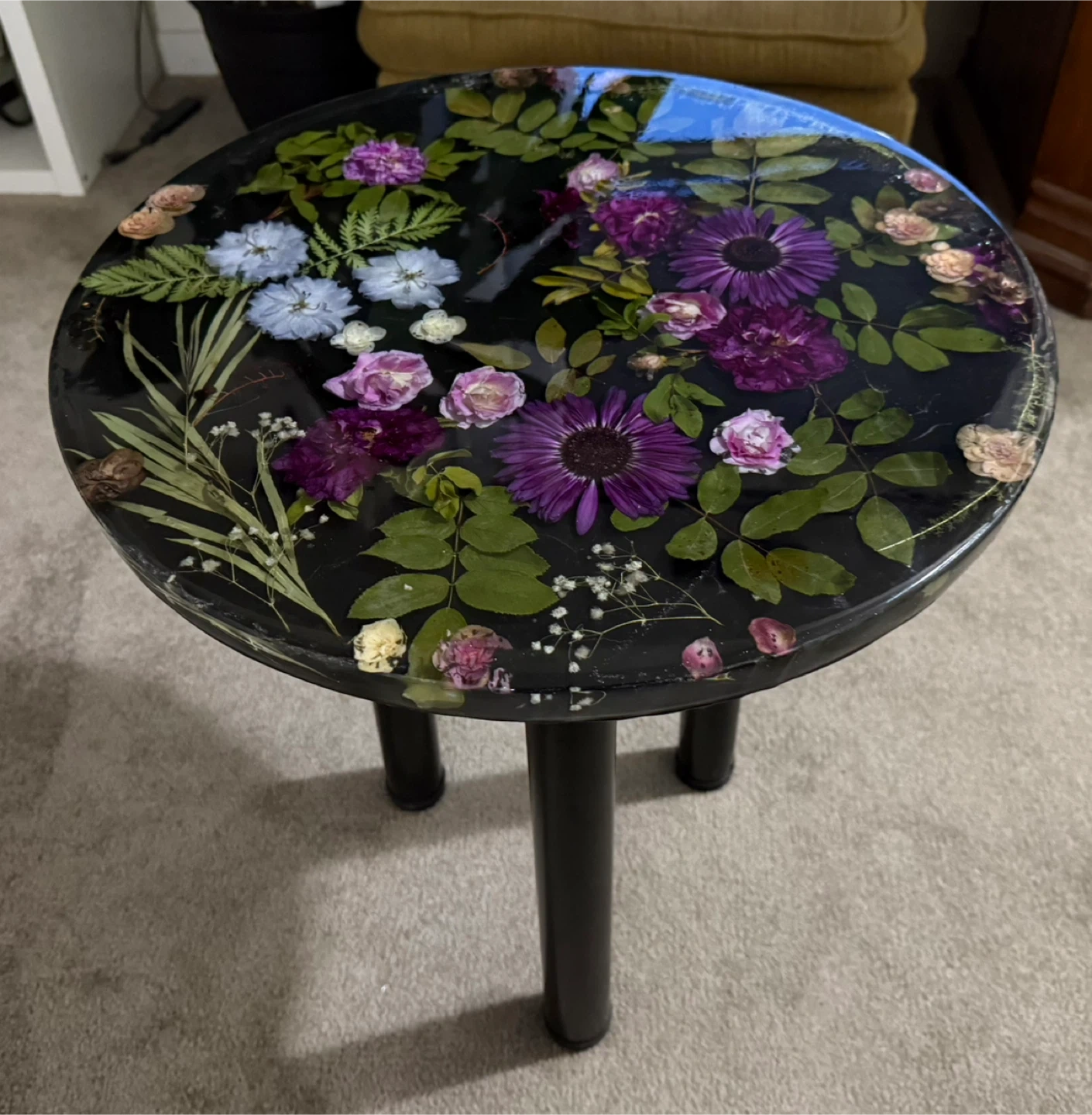 One of a kind handcrafted side table with a beautiful floral resin top and sturdy black legs. It's a lovely piece to add a touch of nature to your living space. All of the flowers were handpicked for this design. Perfect for displaying plants or holding your favourite book or centrepiece.