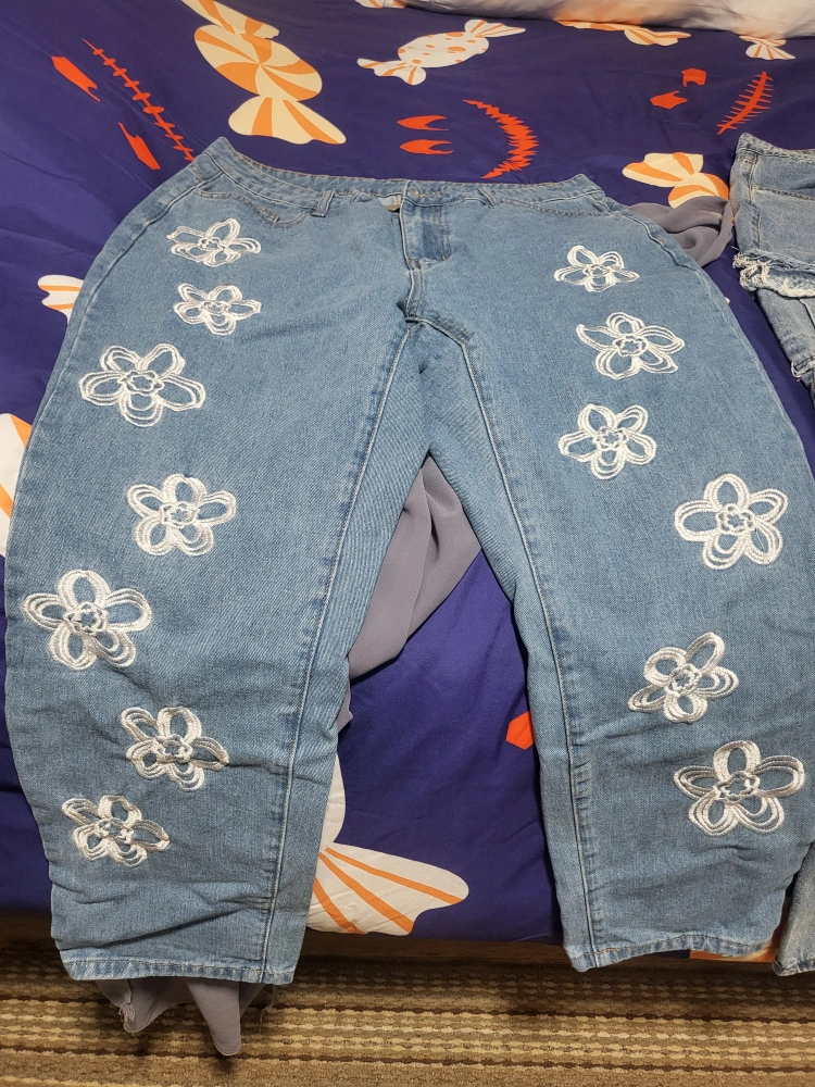 Selling a couple pairs of wide leg jeans! One pair has a floral pattern and the other has a ripped design. They are both in great condition and ready for a new home. (each jeans $27)