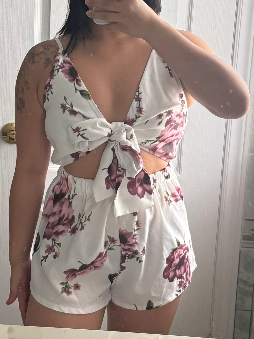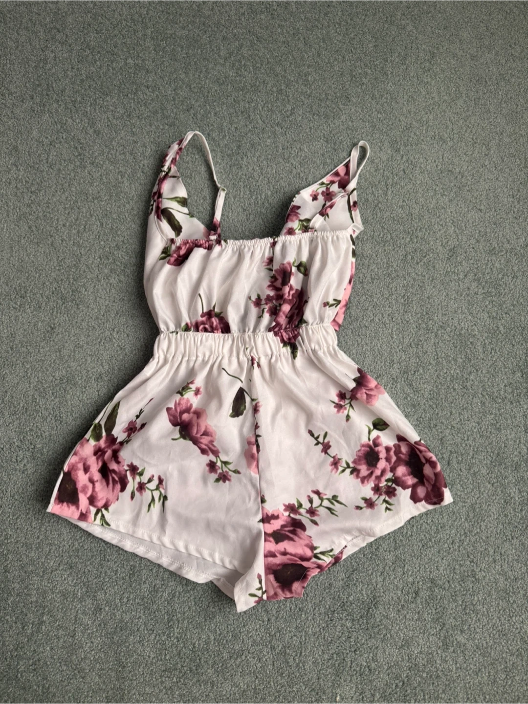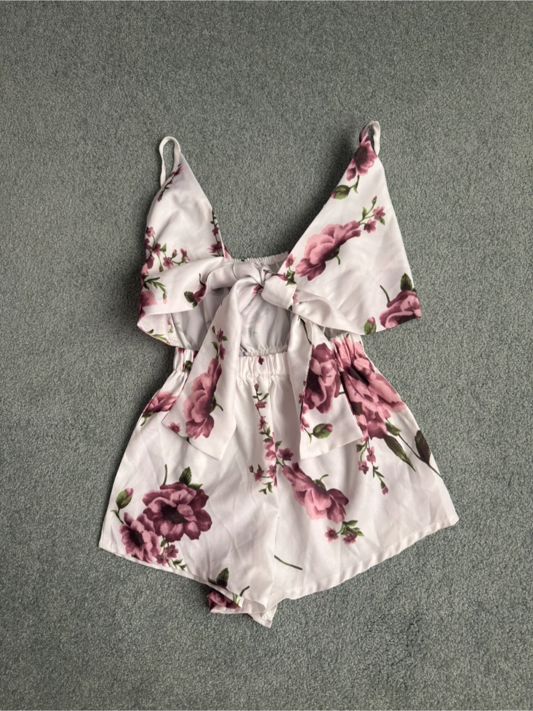 Super cute floral romper, perfect for summer! It's a size small and features a lovely white base with a pink and purple floral pattern. Ties up in the front. In great condition!