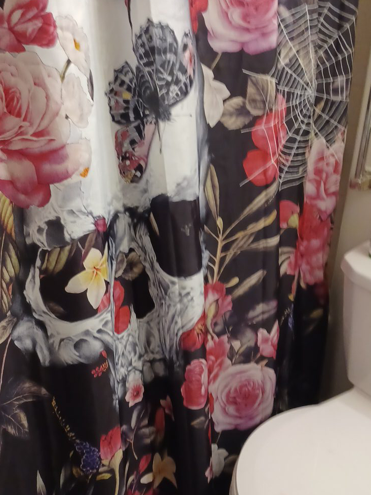 Here's a shower curtain with a unique floral and skull design! It's in great condition and ready to add a touch of gothic charm to your bathroom