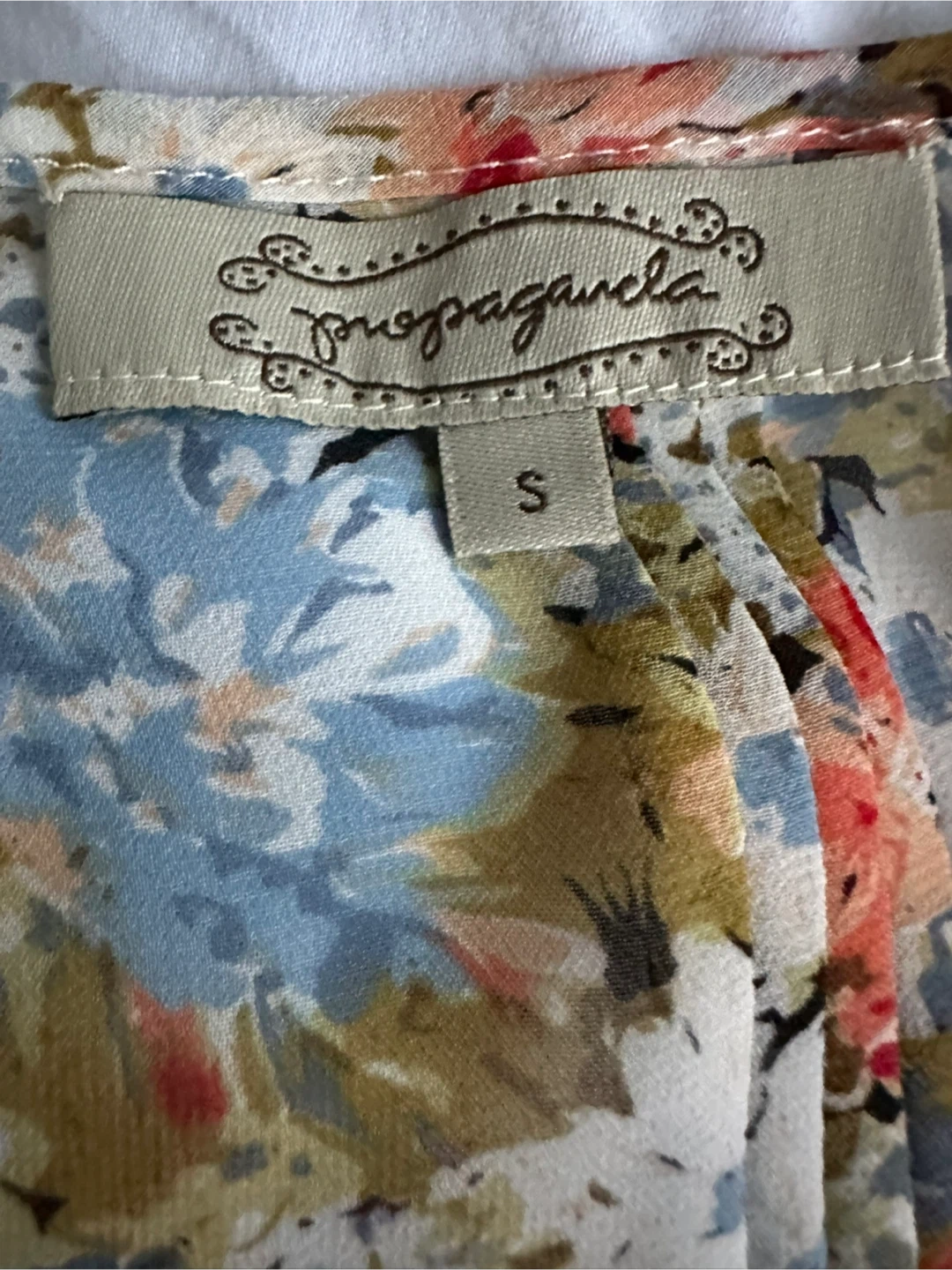 This is a lovely floral sleeveless blouse. It features a delicate floral pattern with pleat details and a high low hem. The blouse has a button-up front and a v-neckline. It is in great condition and would be a wonderful addition to your wardrobe!