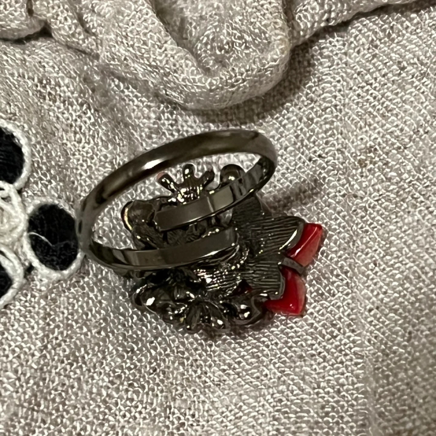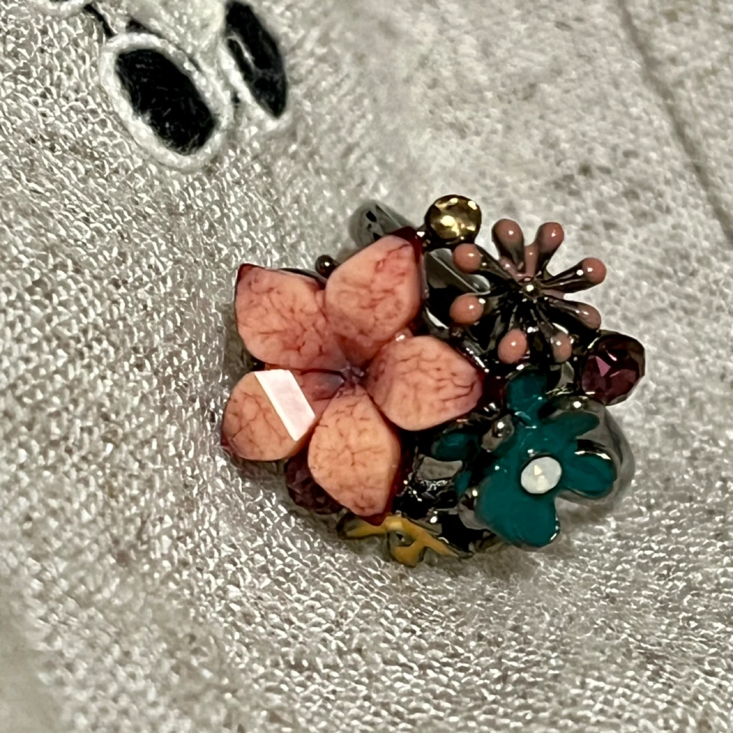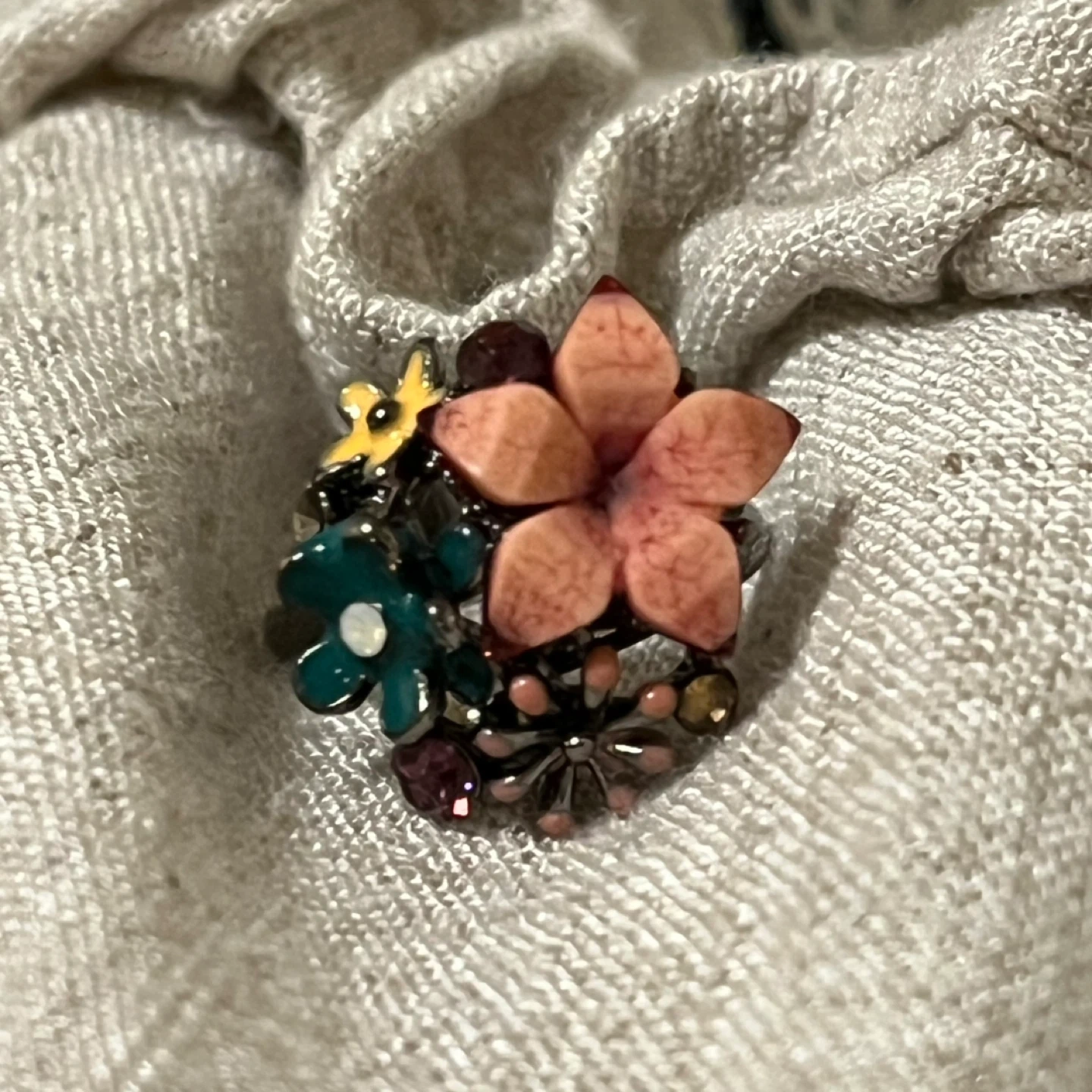 Check out this unique floral statement ring! It features a variety of colourful flowers and beads on a dark metal band. A fun piece to add to your jewelry collection! Please note the ring is on the small side. I have very small hands and it fits on my index finger.