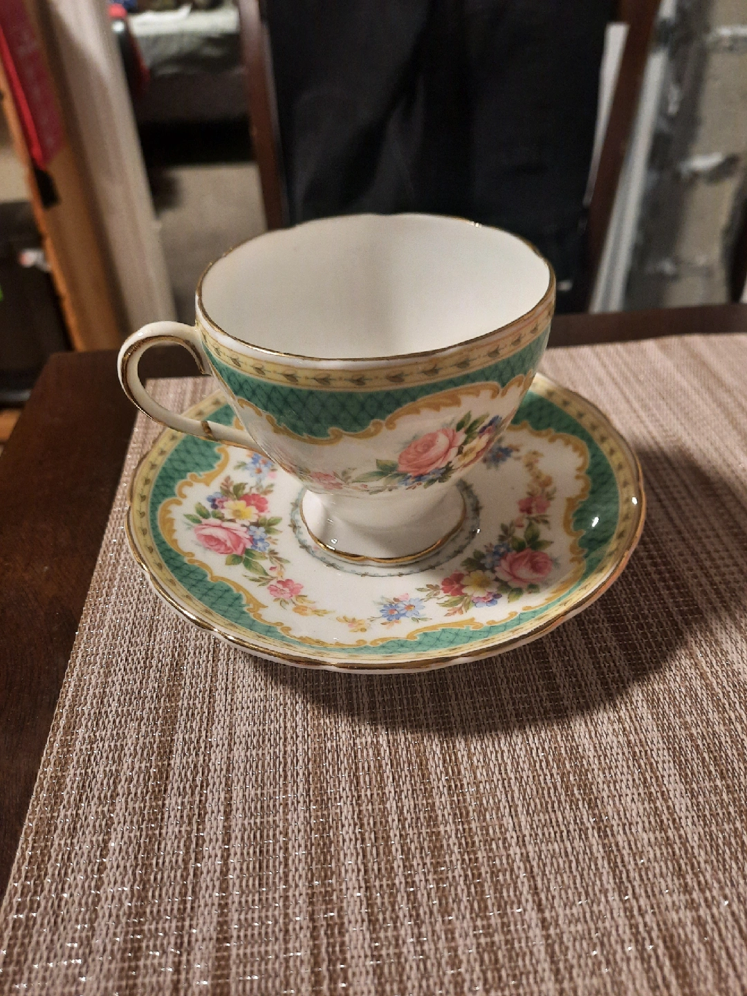 A beautiful tea cup and saucer set featuring a delicate floral design. The cup has a gold trim and a comfortable handle. Perfect for enjoying your favourite tea!