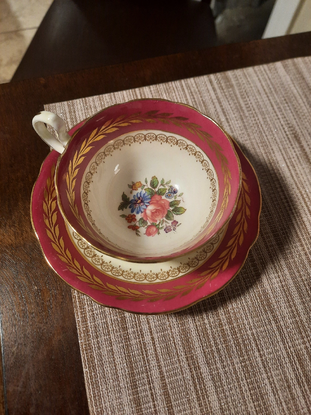 Selling a beautiful teacup and saucer set. The teacup features a lovely floral design inside, and the set is trimmed with gold detailing. Perfect for adding a touch of elegance to your tea time