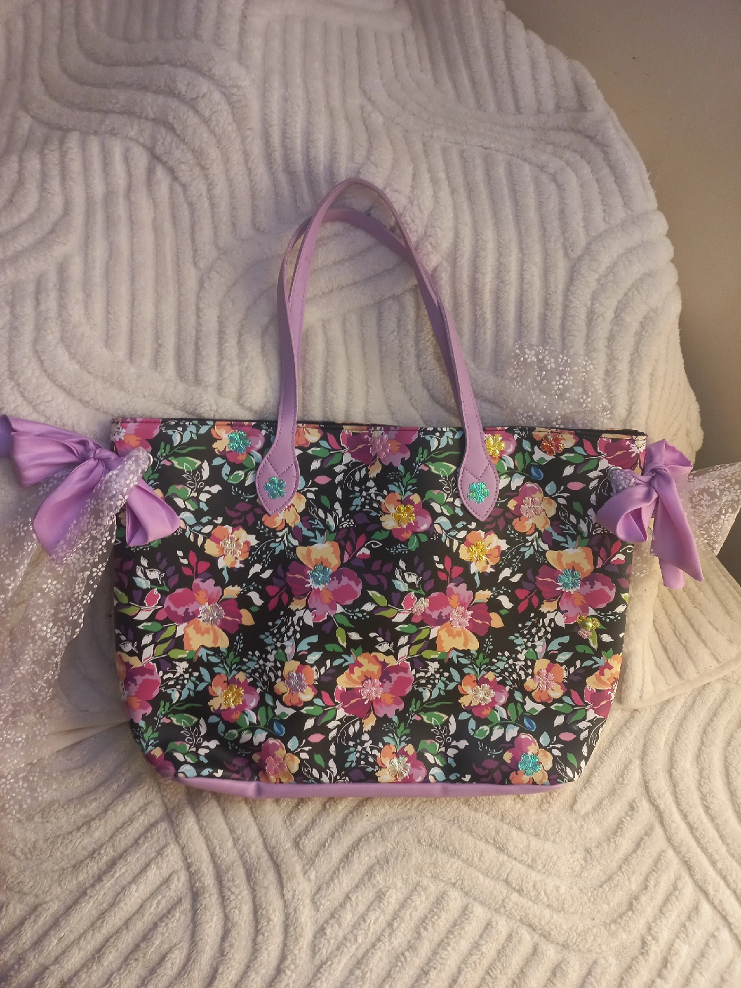 Cute tote bag featuring a vibrant floral pattern with sweet bow accents! The bag is in great condition and ready for a new home. Perfect for carrying your essentials in style!