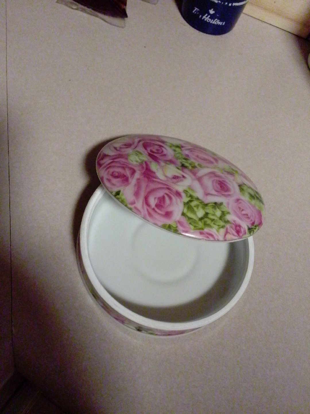A lovely trinket dish with a floral design on the lid. Perfect for storing small items or as a decorative piece