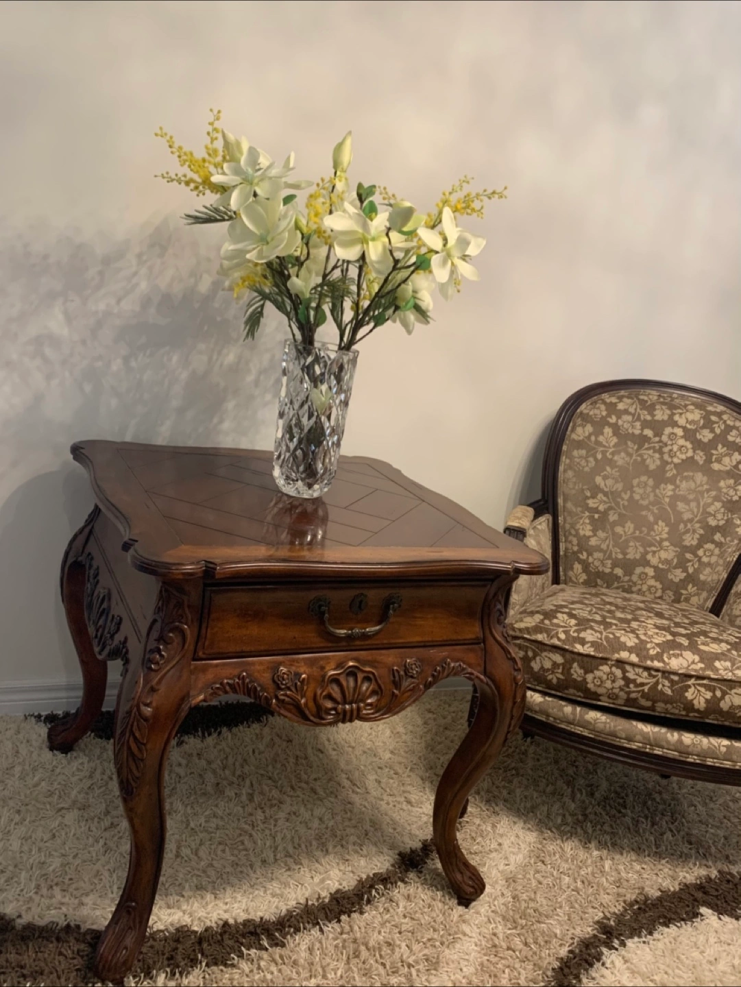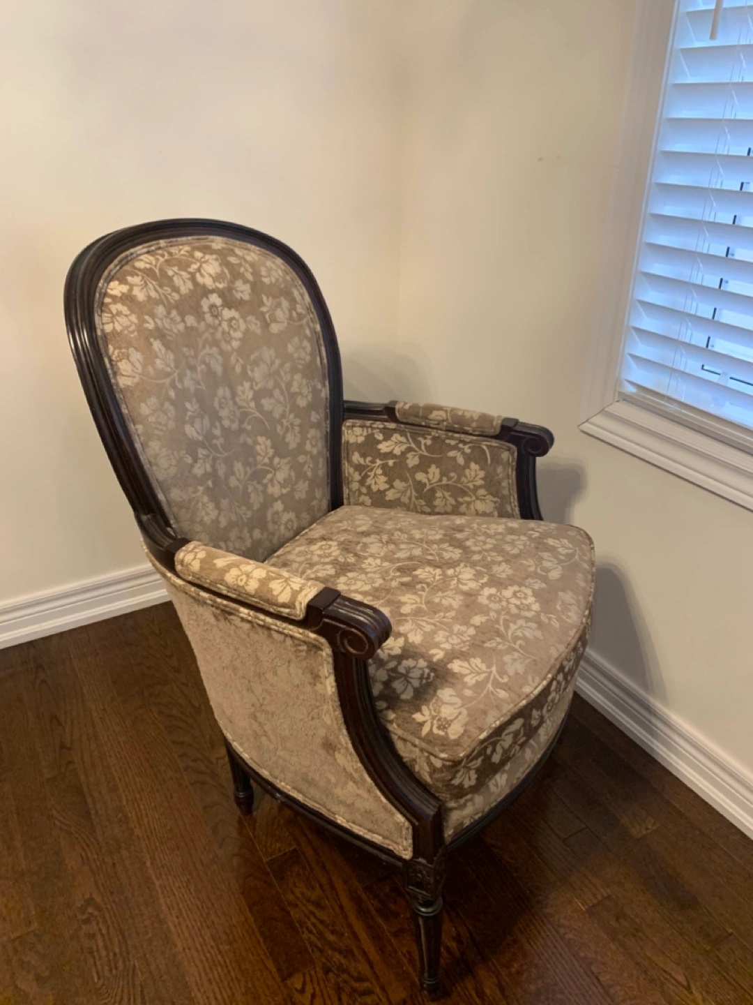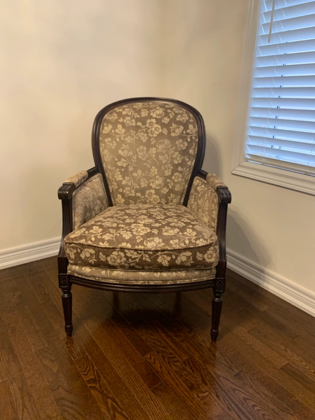 Selling a lovely floral upholstered armchair. It's in great shape and would look wonderful in any living room or bedroom! The dark wood frame is in good condition and the floral pattern is very charming