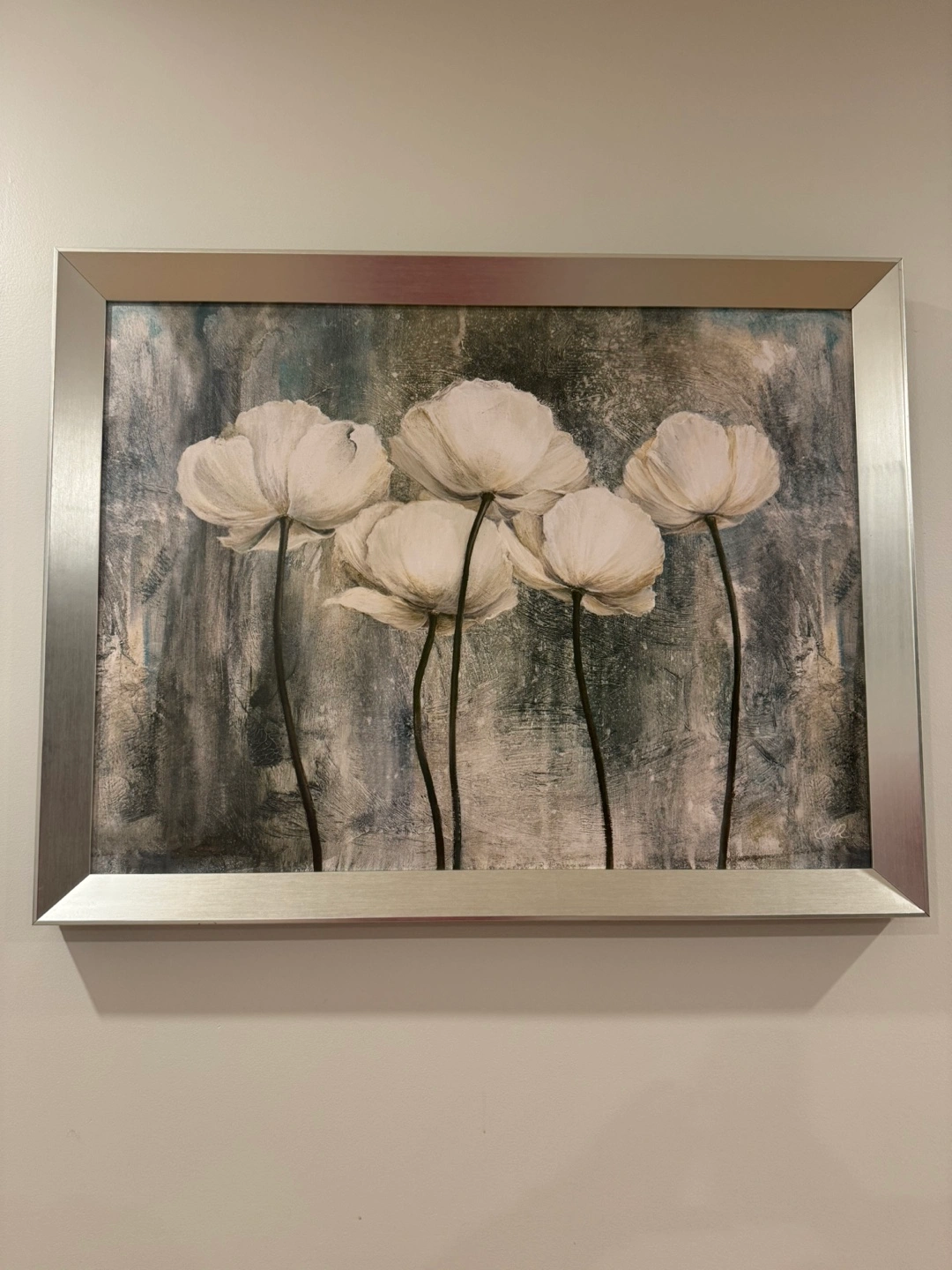 Large painting features white flowers against a textured background, all framed in a silver frame. It’s in great condition. Pick up in Okotoks.