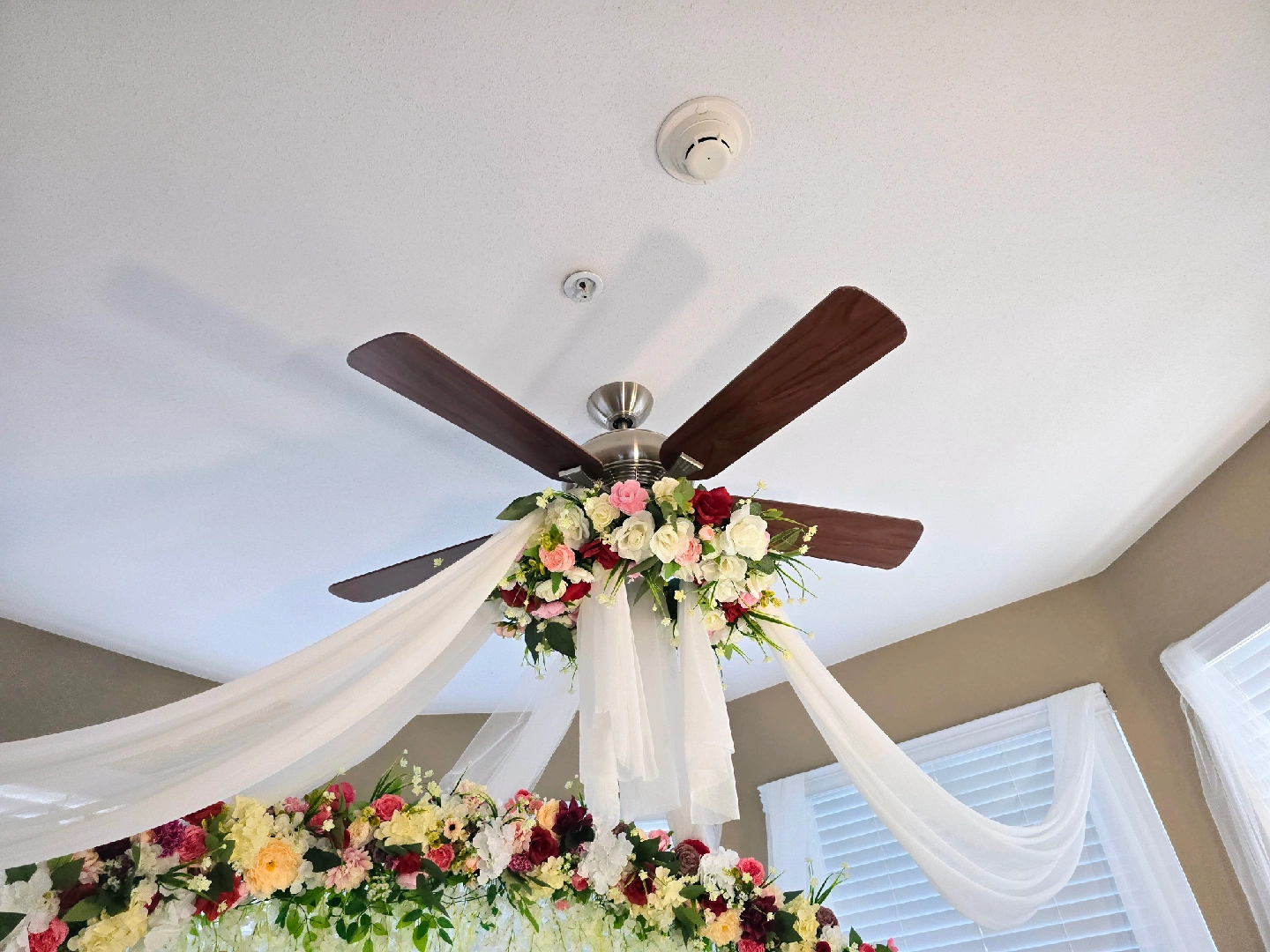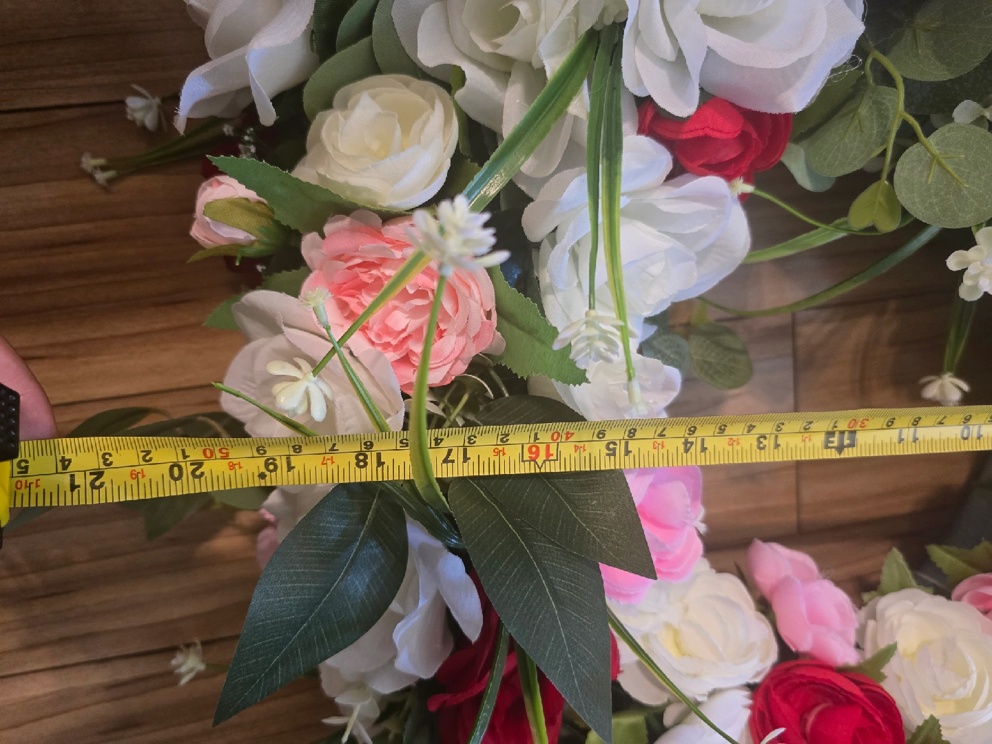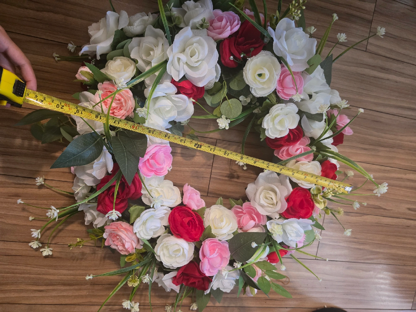 Selling a lovely floral wreath! It measures approximately 20 inches in diameter. Perfect for adding a touch of elegance to any event! Handmade flower ring that I hung from the fan for my wedding. Can be hung from anything really as a chandelier. It's lightweight as the top portion of the ring is not covered in flowers Cash and pick up only. FCFS