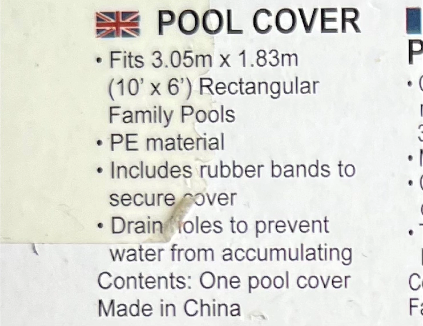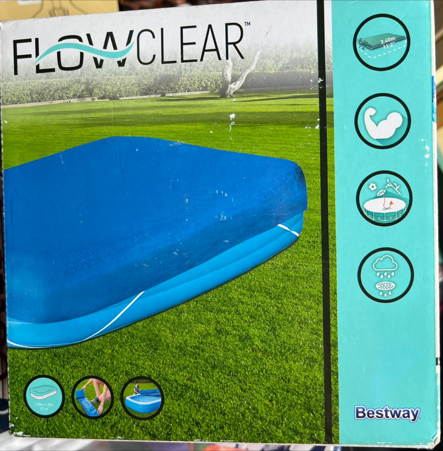 I'm selling a Flowclear pool cover that's perfect for family pools! It fits 3.05m x 1.83m (10' x 6') rectangular pools. It's made of PE material and includes rubber bands to secure the cover. Plus, it has drain holes to prevent water from accumulating. Contents: One pool cover