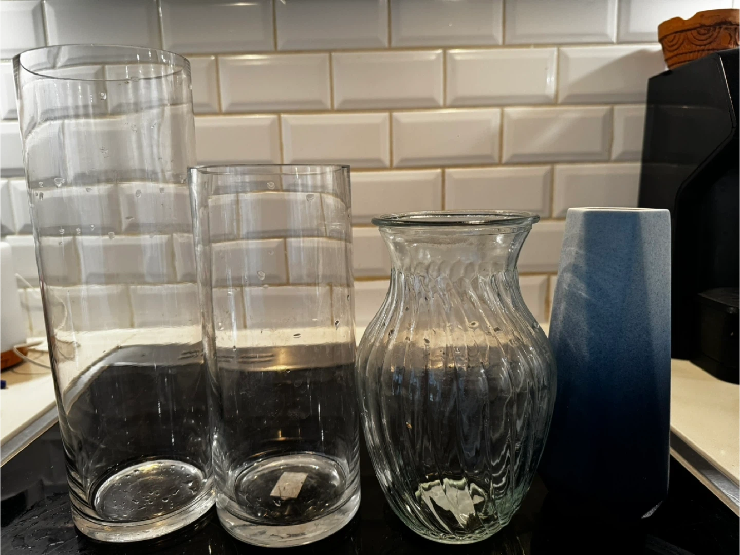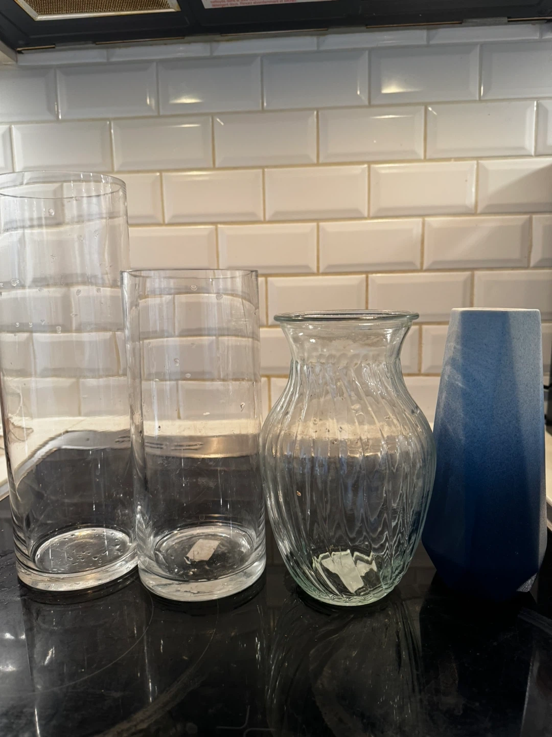 Selling a collection of vases in various shapes and materials! There are two clear glass cylinder vases, one clear glass vase with a decorative wavy design, and a blue ceramic vase. They're all in good condition and ready to display your favourite flowers Each is sold at $5 and $12 for all three