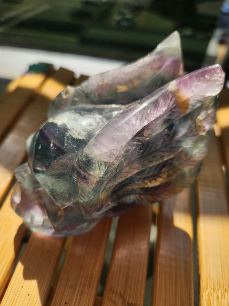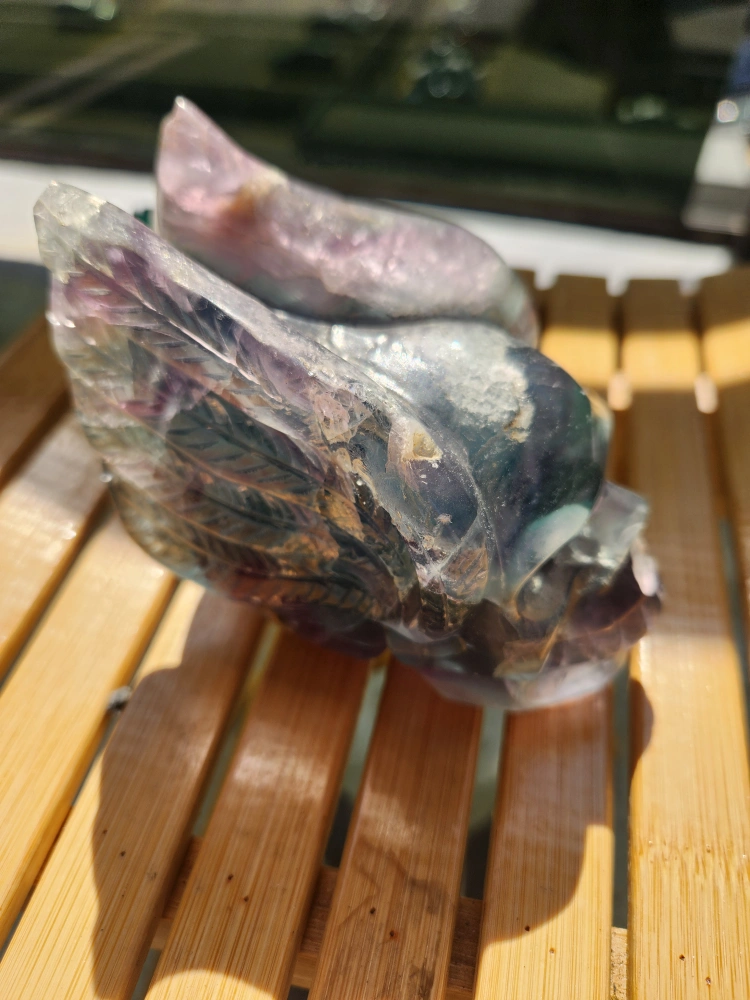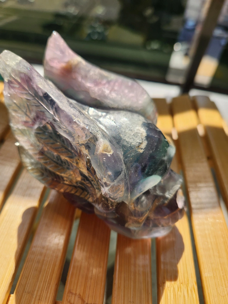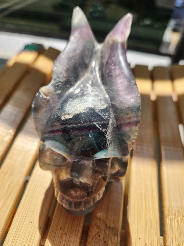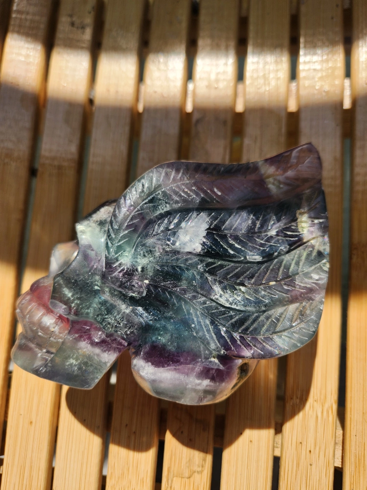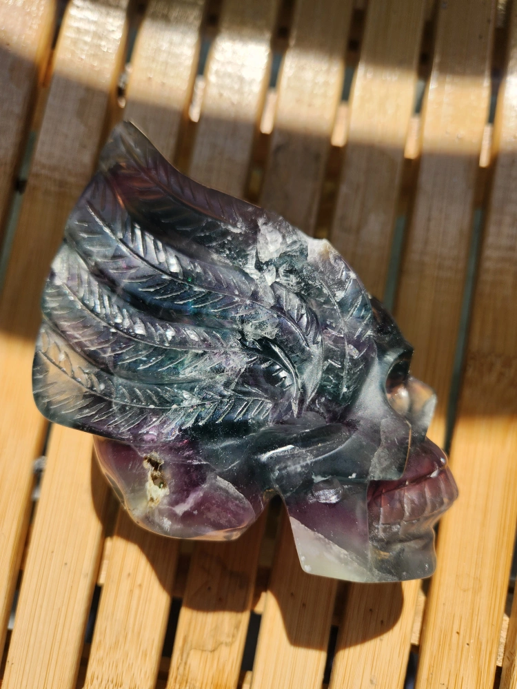 Here's a unique fluorite crystal skull! It has a beautiful mix of purple, green, and clear hues. The skull features intricate carvings that add to its character. It would make a great addition to any crystal collection or as a decorative piece