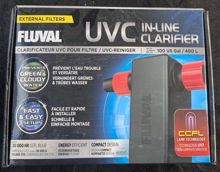 Selling a Fluval UVC In-Line Clarifier for up to 100 US Gal / 400 L aquariums! It prevents green and cloudy water with fast and easy setup. The compact design is energy efficient, and it uses a CCFL lamp technology.