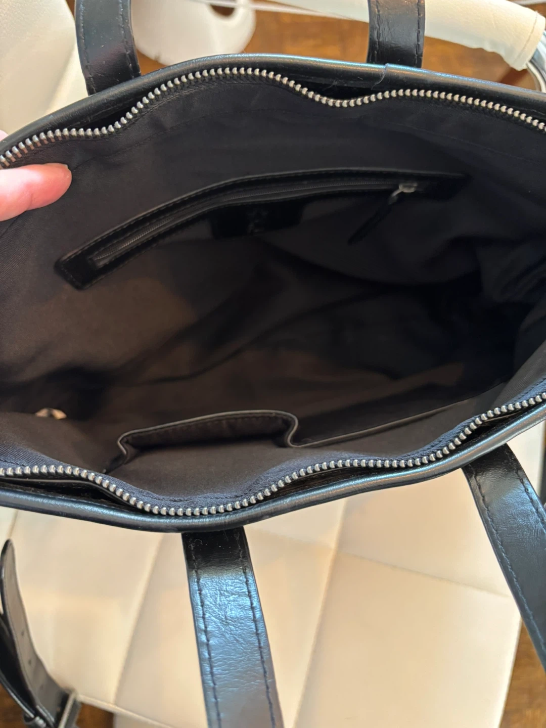 This bag has been well loved but still has some great life to it. It has multiple storage compartments. 16” w x 11” h x 3.75” d The adjustable strap is 40” long Silver hardware. *** with this lighting, the pictures make it look worse than it is.